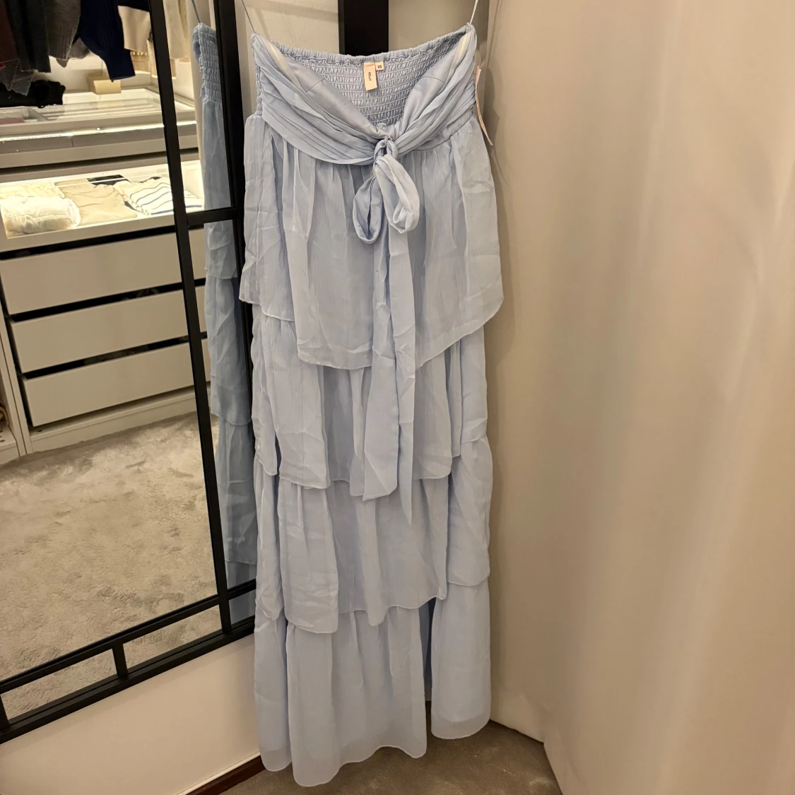 Oanvänd ljusblå volangklänning med rosett