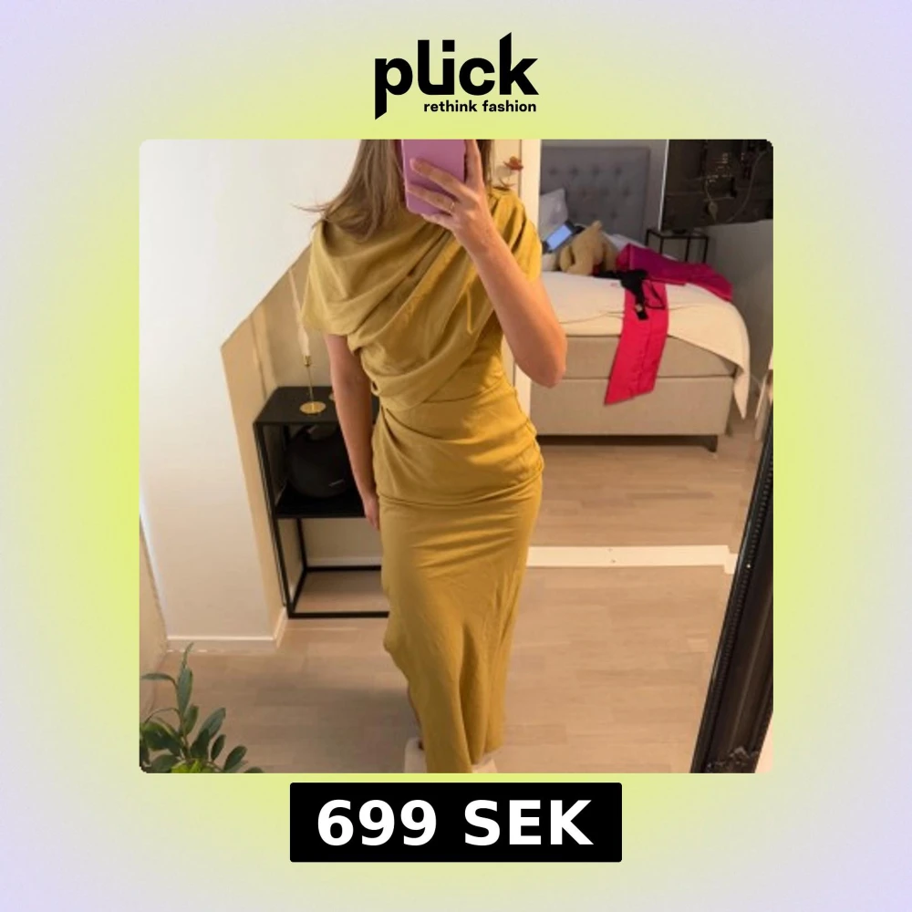 Säljer en elegant ockragul långklänning med draperad design och korta ärmar. Klänningen har en smickrande passform med en slits på sidan och en öppen rygg. Perfekt för speciella tillfällen! 🌟