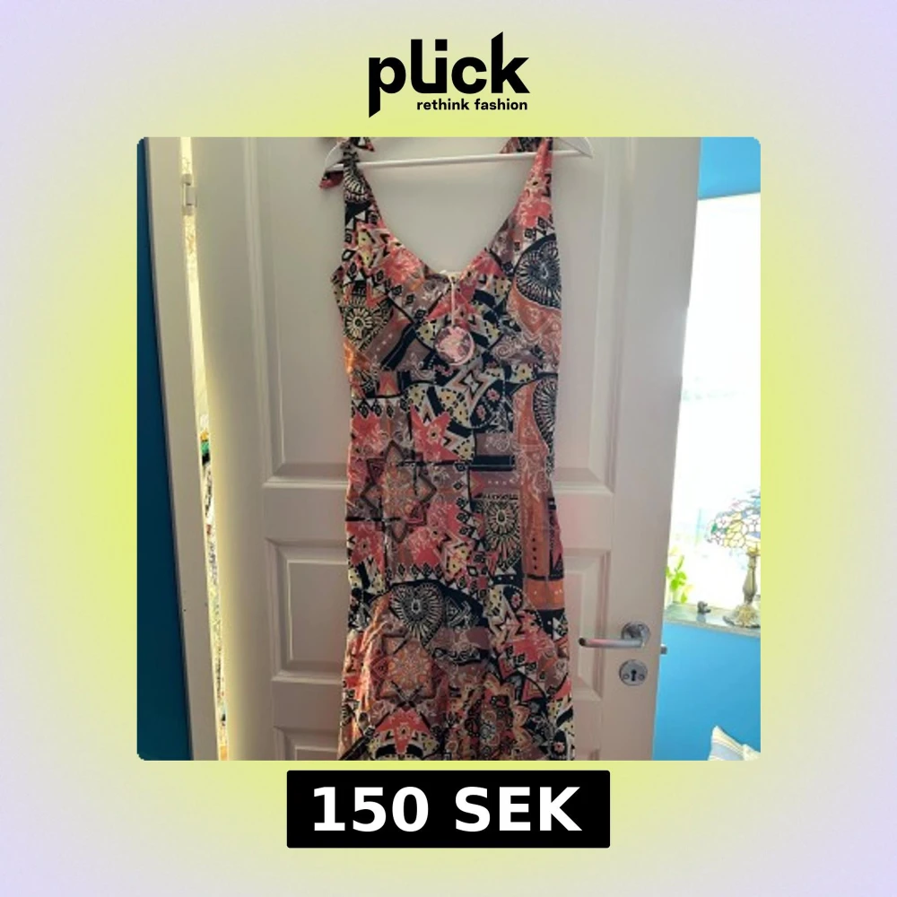 Säljer en färgglad klänning från Odd Molly med ett unikt mönster i svart, rosa och orange. Klänningen har en v-ringad hals och knytband. Helt ny! Strl 1 el S.