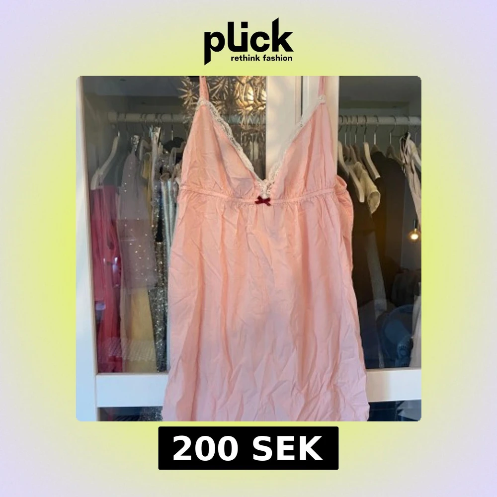 Rosa klänning med tunna axelband och vita spetsdetaljer.