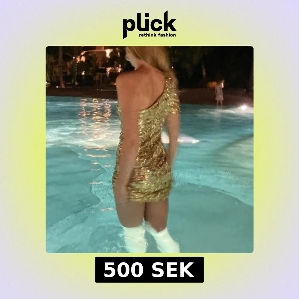 Säljer en superglittrig kort klänning i guld med one shoulder-design. Klänningen har en tight passform och är täckt av paljetter som verkligen fångar ljuset. Perfekt för allt! 💞