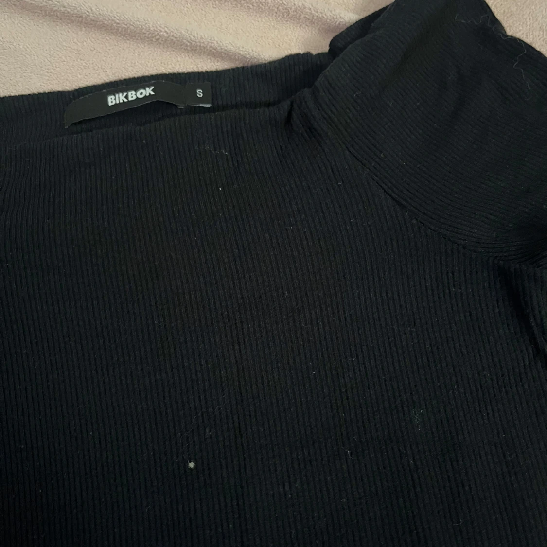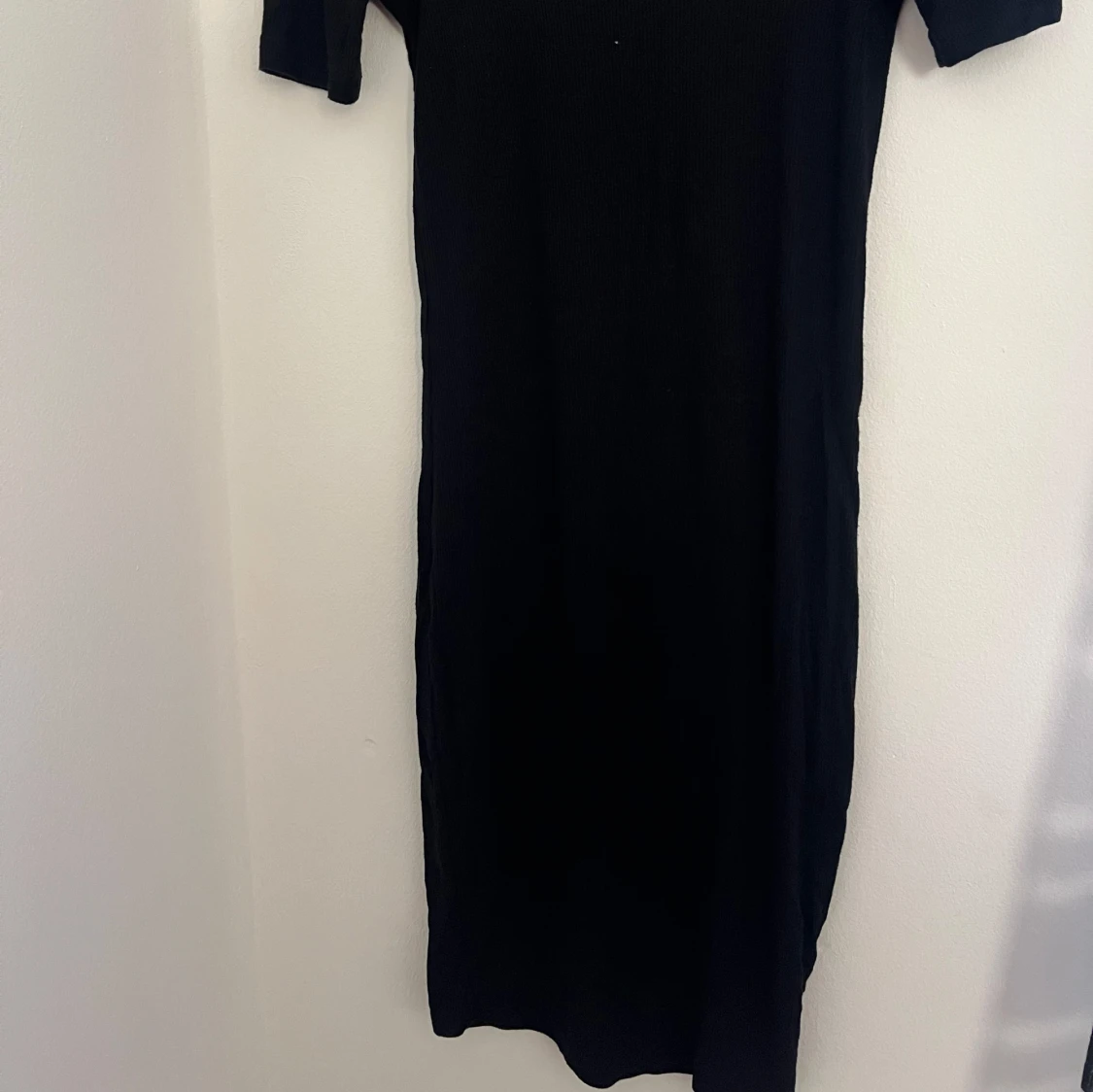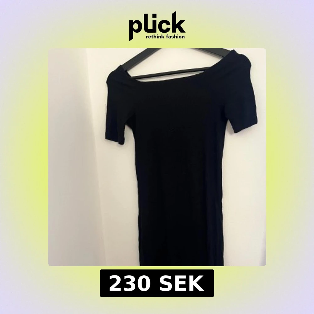 Snygg svart offshoulder klänning från BikBok i ribbat material. Den är i strl S men är ganska stretchig och väldigt bekväm. Har inga defekter ser ut som ny.