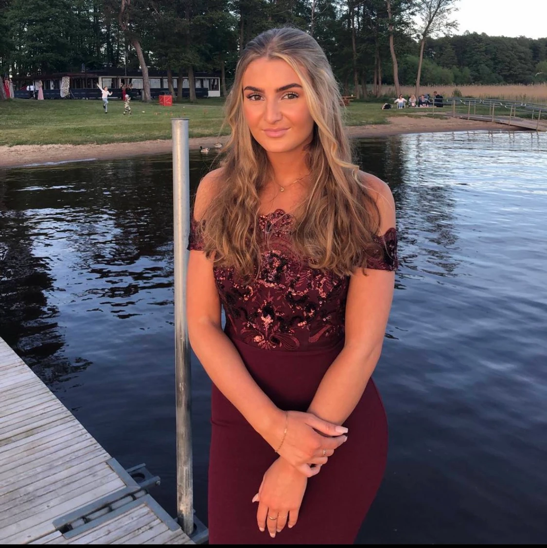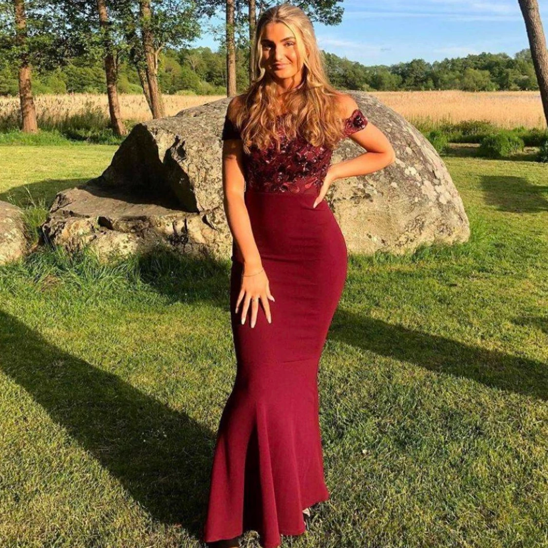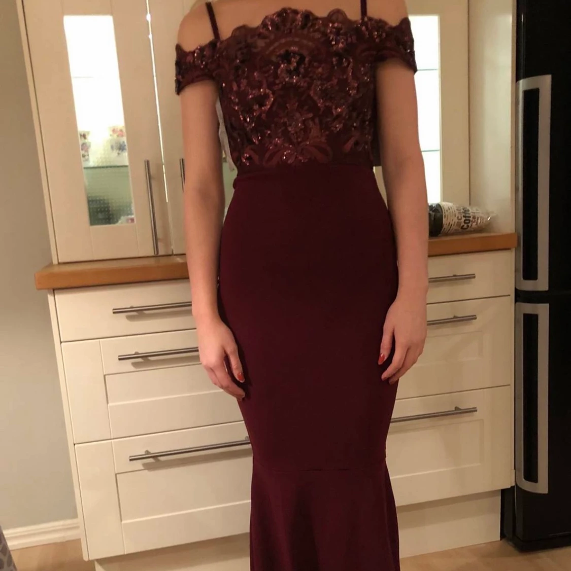 Säljer min vinröda off shoulder balklänning i storlek 36, (det är mina bh band som syns på sista bilden) endast använd en gång och den är i nyskick!
