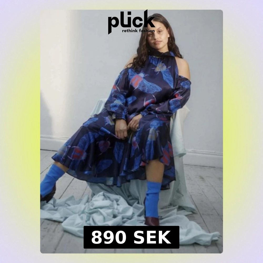 Blifinast på vinterns fester! Rodebjer Gizi handmålad klänning med nattfjärilar i storlek medium men rymlig Material: siden med viskosfoder Skick: Använd en gång. Hittar inget att anmärka på. Lappar finns kvar. Klänningen har offshoulder-design, volangdetalj nertill och hög krage med rynk. Långa ärmar med resår vid ärmslut. Materialet är lätt och har ett snyggt fall.