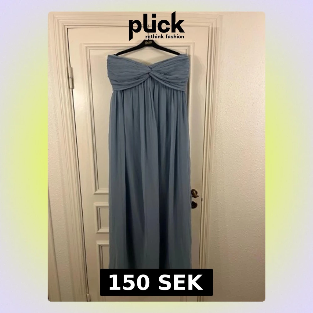 Säljer en elegant ljusblå långklänning med axelbandslös design och draperad överdel. Klänningen har ett vackert fall och är tillverkad i ett tunt, svepande polyestertyg som ger en mjuk och luftig känsla. Perfekt för dig som vill ha en stilren och romantisk look.
