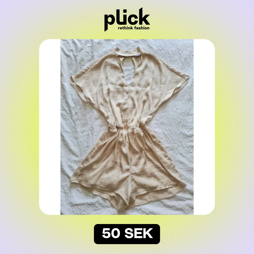 Väldigt söt byxdress i silkesartat material. Beige/ offwhite. Små cutouts på rygg och vid bröst. Saknas en knapp, men den är fullt funktionell med bara den ena