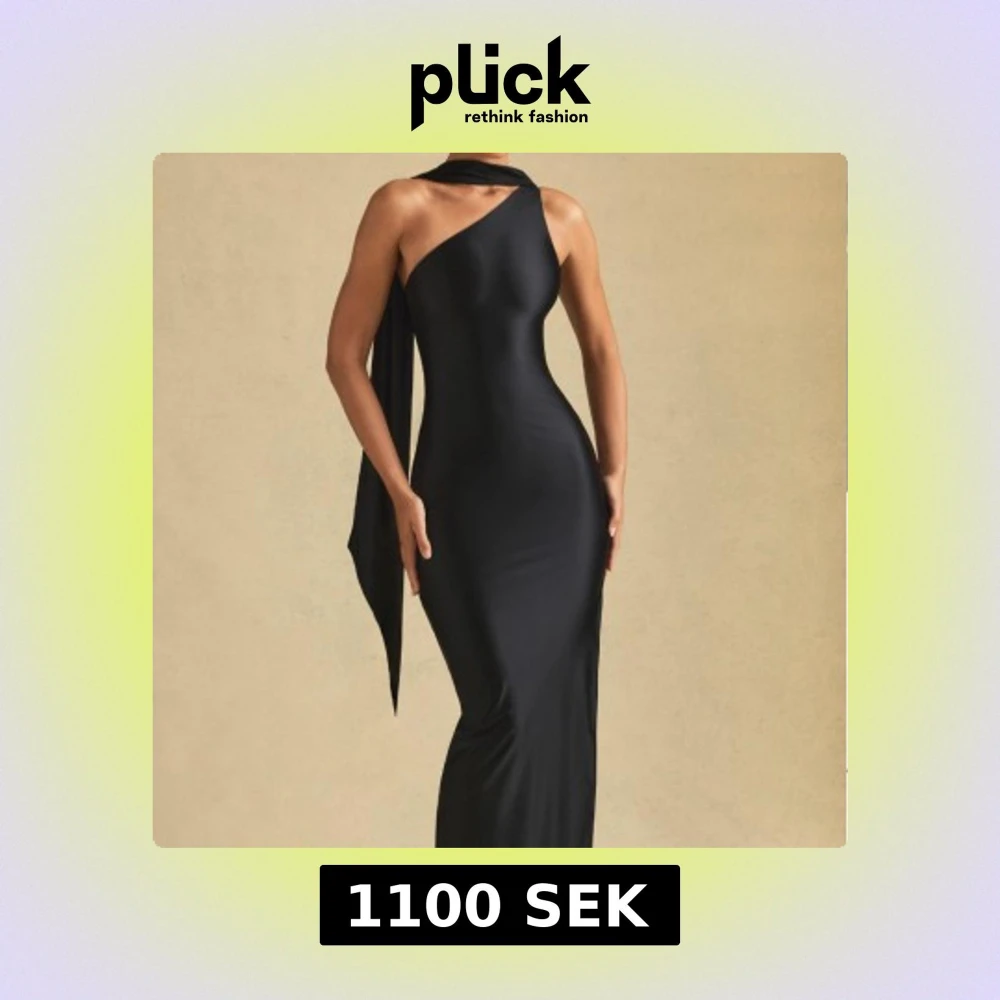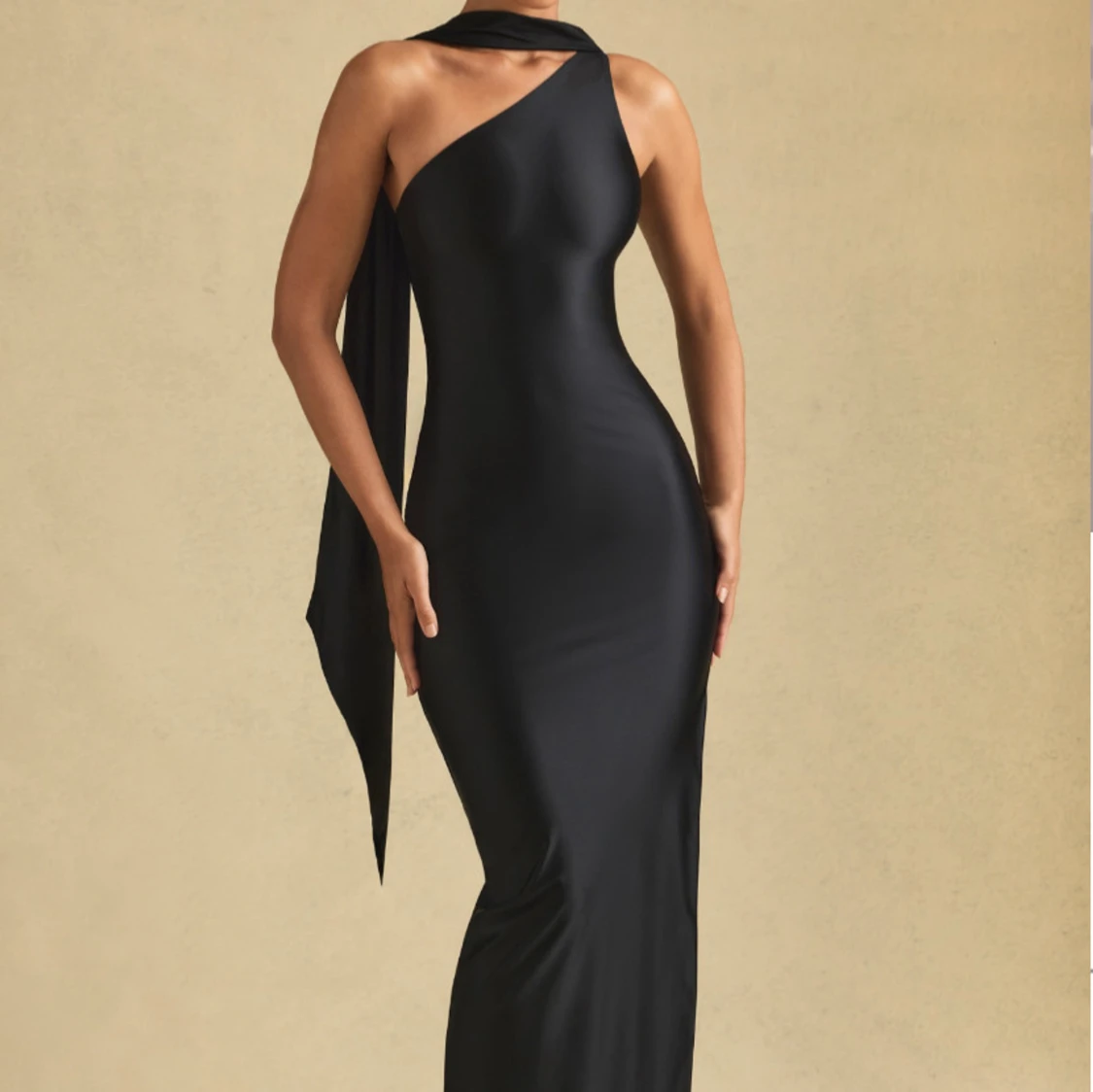 Säljer en svart långklänning med oneshoulder-design och snygg scarf-detalj vid halsen. Klänningen är tight och figurnära med en elegant och stilren look. Har endast använt klänningen en gång. Köpt på oh Polly’s hemsida för 1400kr 🫶🏼❤️