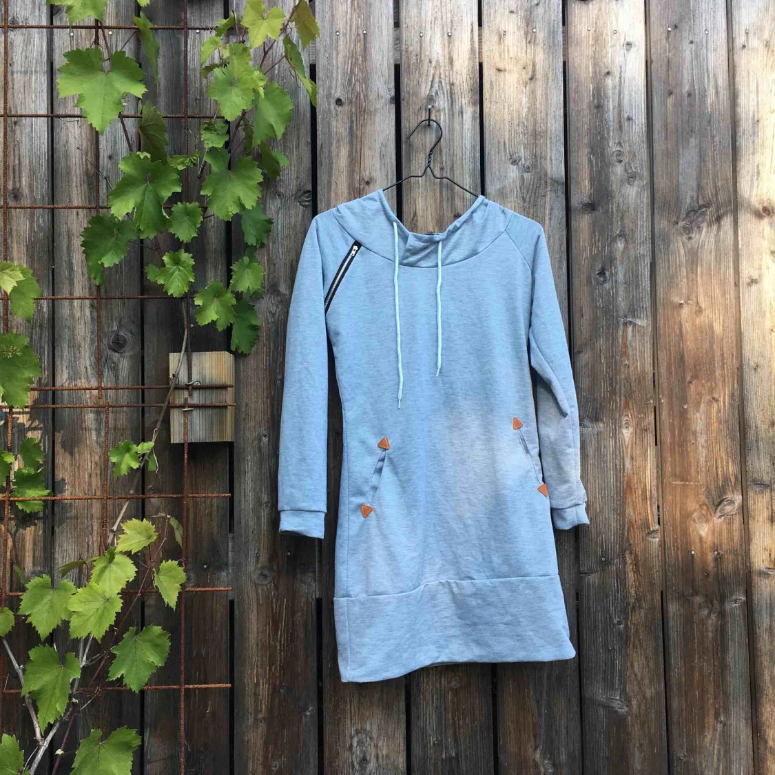 Kort ”hoodieklänning” med fickor. Relativt tunt tyg. Öppningsbar dekorationsdragkedja vid ena axeln. Slutar ca mitt på låren. Märkt M men passar S.