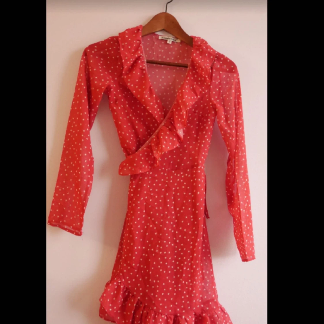 Röd prickig (stjärnor) omlottklänning. Storlek 34 XS skulle jag säga ganska kort Kan hämtas i Lerum eller skickas för 40kr