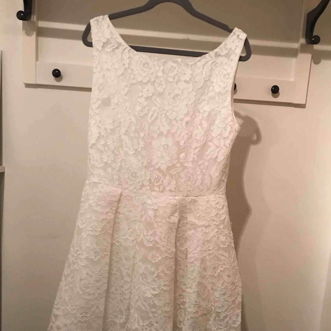 Vit spetsklänning, i helt ok skick. Vid noggrann inspektion ses slitna partier, se bild 3. 100kr inklusive frakt, kan mötas upp i Stockholm.