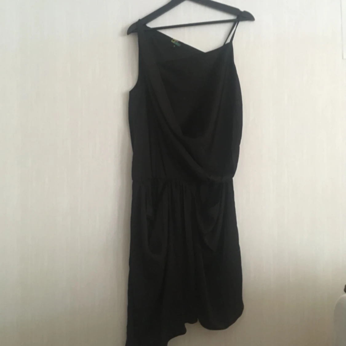 Svart asymmetrisk klänning med resor i midjan och sidofickor. Knappt använd! Kan hämtas i Göteborg eller skickas. Köparen står för frakten!