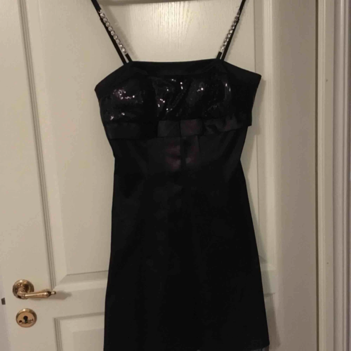 Vacker festklänning endast använd två ggr. Storlek XL. Svart med paljetter och rosett i byst, stenar i axelband och med tyll underkjol för vackert fall.