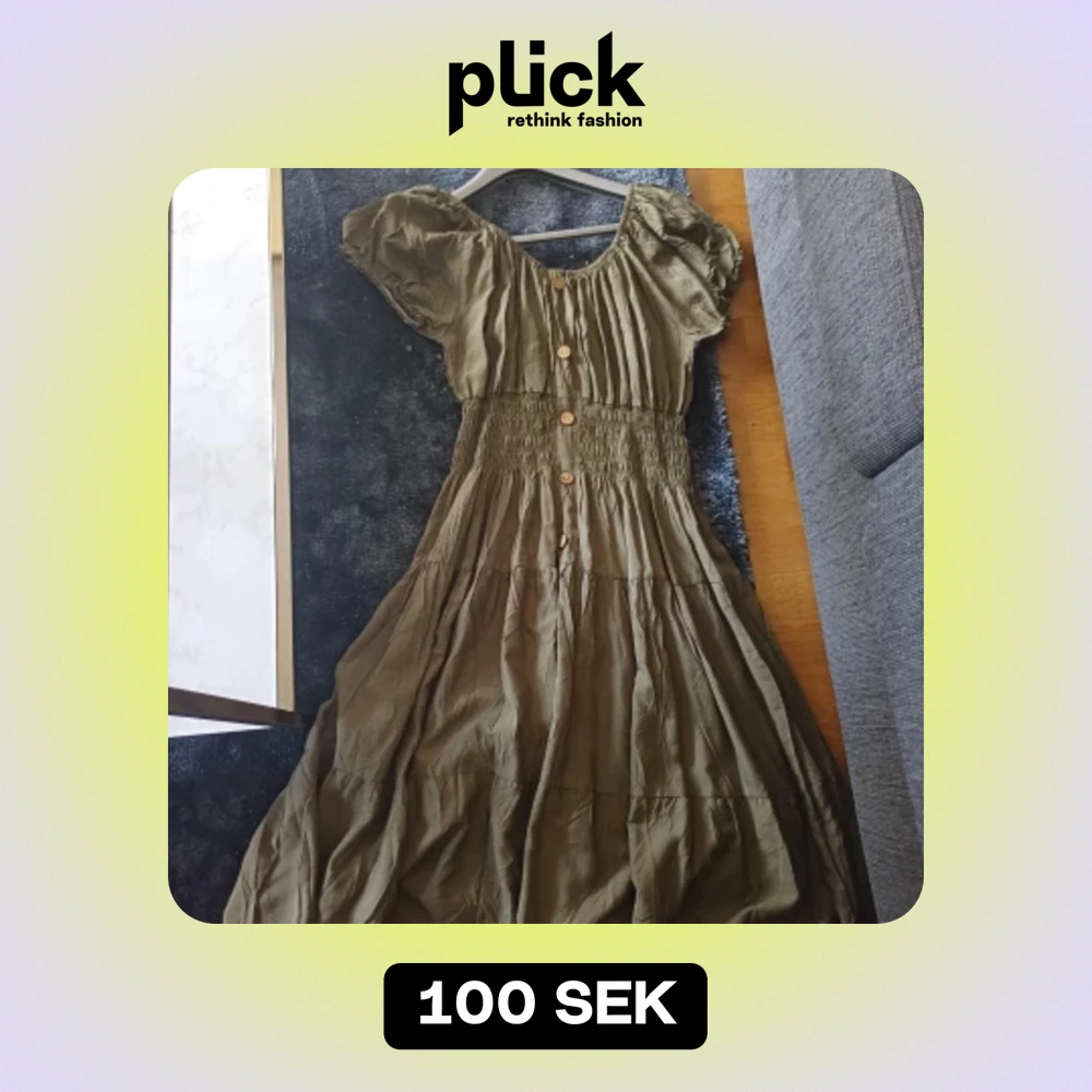 Säljer en superfin olivgrön klänning med korta puffärmar och knappar framtill. Klänningen har en smockad midja som ger en snygg passform och ett flowy kjolparti. Perfekt för sommarens. Skriv vid frågor!💚🫶🫶