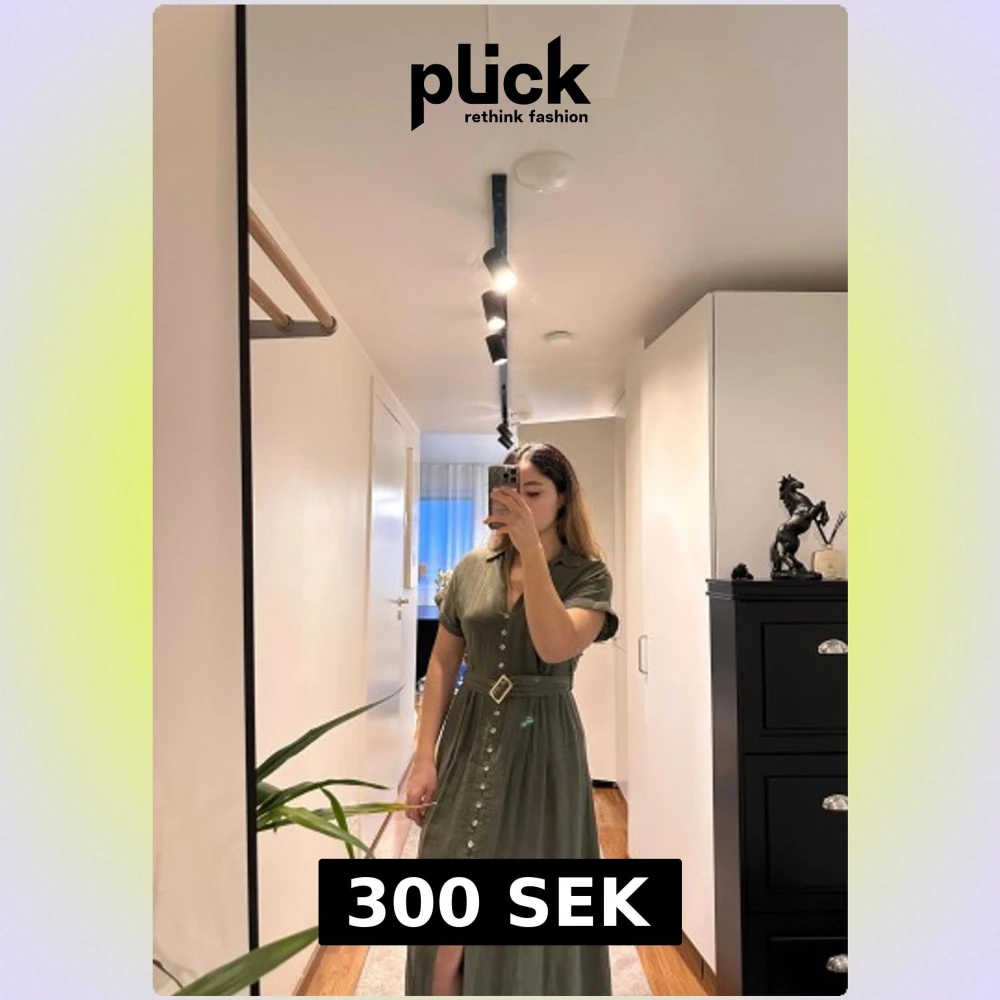 Olivgrön långklänning från Zara i linne med korta ärmar, v-ringning och knappar längs hela framsidan. Klänningen har ett matchande bälte i midjan och en liten slits framtill. Perfekt för dig som gillar en avslappnad men ändå stilren look.