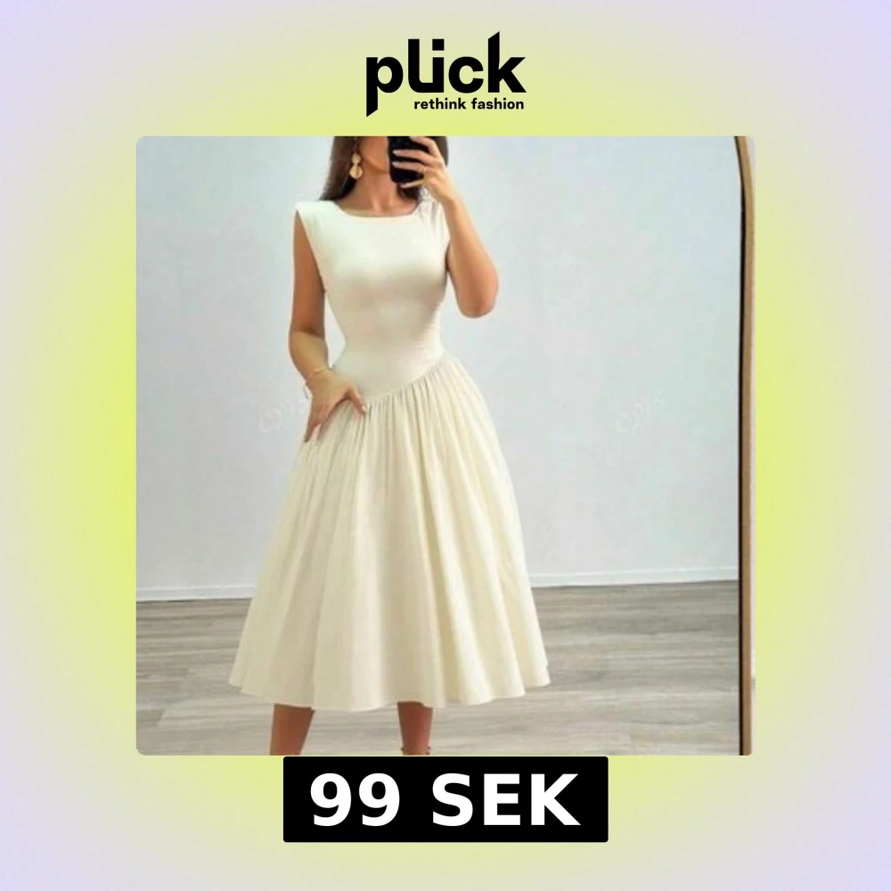 Superfin champagne/vit färgad klänning med markerad midja, omlott och snörning i ryggen. Klänningen är ärmlös, har rund halsringning och ett vackert, svängigt kjolparti i midi-längd. Perfekt för sommarens alla tillfällen!
