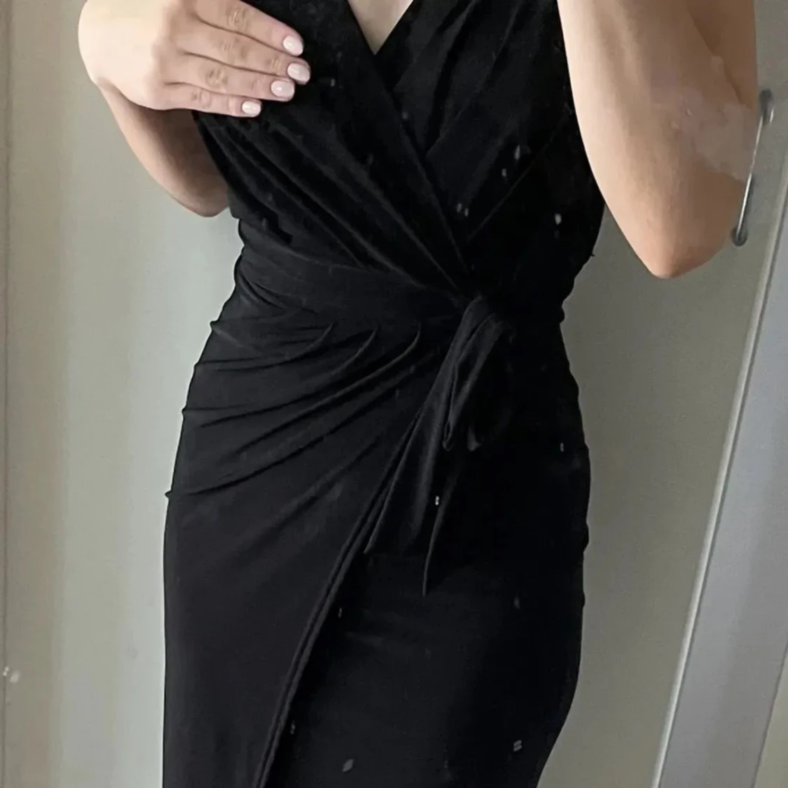 Så så skön klänning! Materialet känns som silke. Du knyter själv i midjan vilket gör att du kan välja hur tight den är i bröstet och i midjan! Passar M, S, XS. Aldrig använd. Låg i ryggen och slutar ungefär vid knäna. Ps! Smutset är från spegeln inte