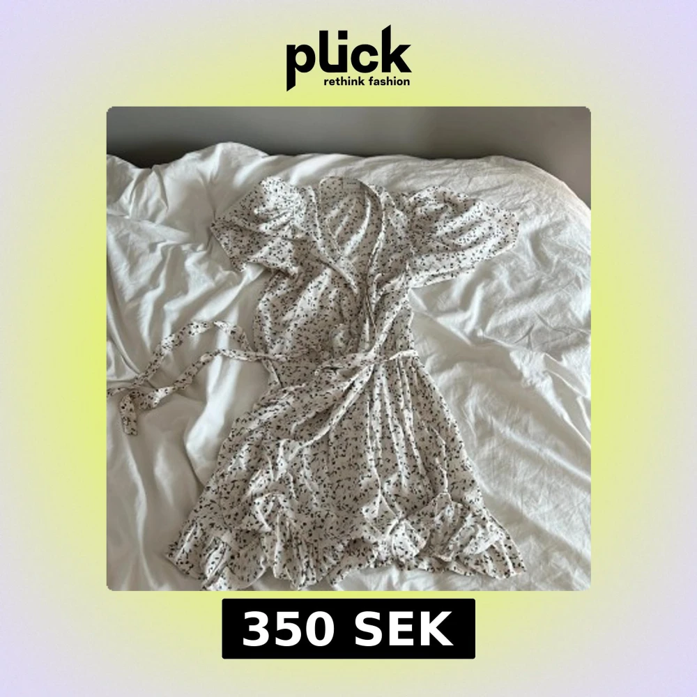Supersöt vit omlottklänning från Vila med små blommor i grönt och rosa. Klänningen har korta puffärmar, volangkant nertill och knyts i midjan. Perfekt för sommarens alla tillfällen!