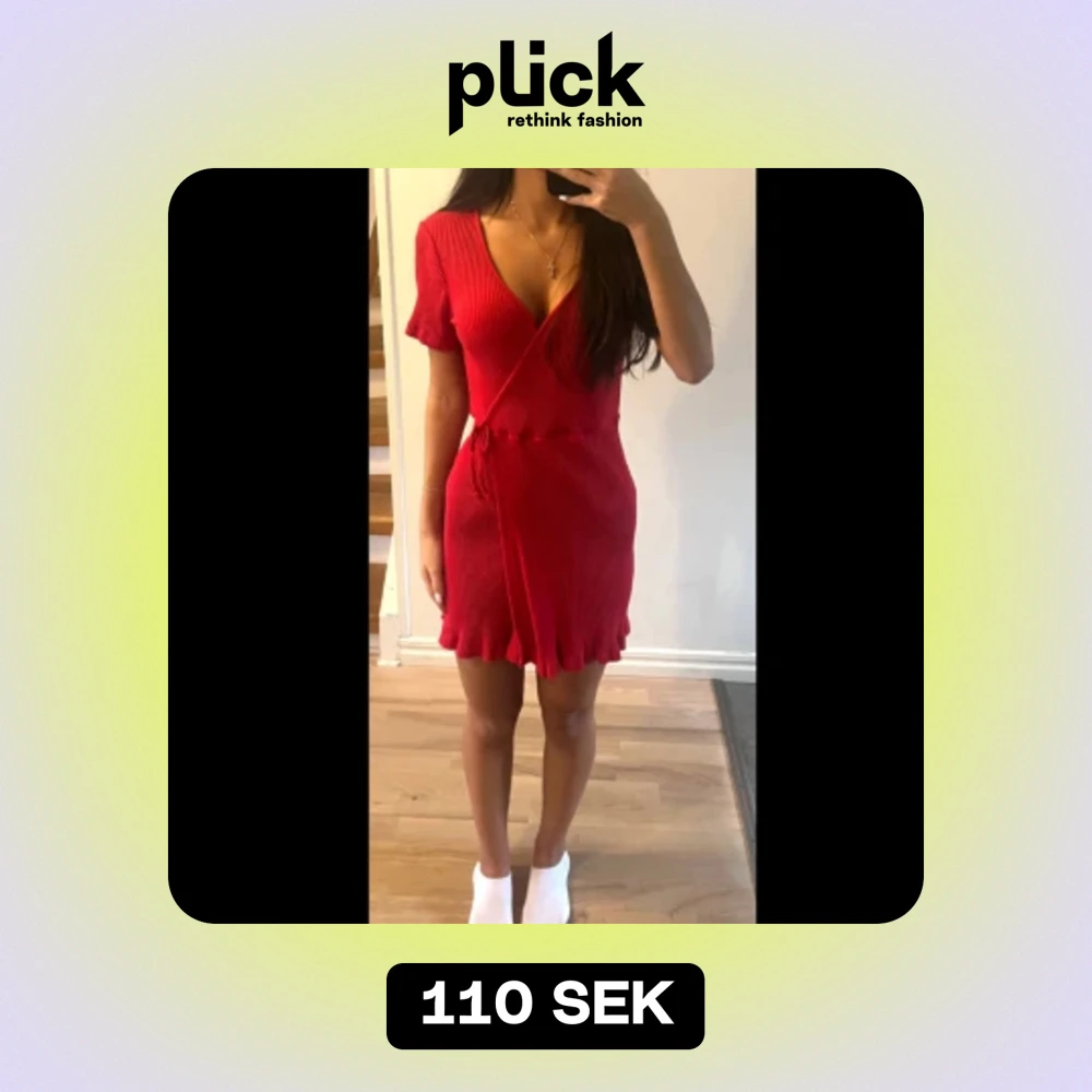 Säljer en superfin röd omlottklänning med korta ärmar och v-ringning. Klänningen har en ribbad struktur och volangdetaljer vid fållen. Perfekt för sommarens fester eller en mysig kväll ute. Den är både bekväm och stilren😊