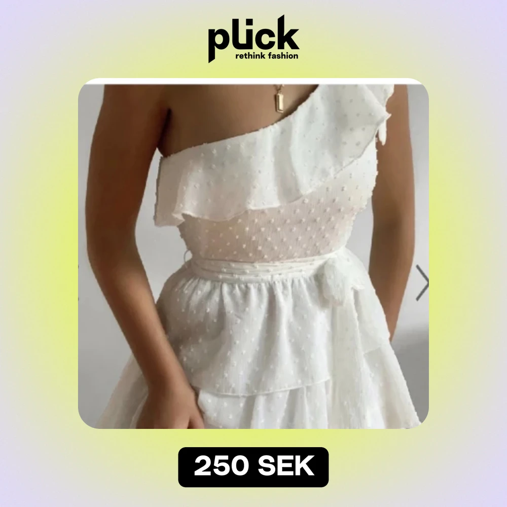 Så fin vit one shoulder klänning från showpo men volanger. Den är helt oanvänd och har prislappen kvar. Säljer den då jag tyvärr inte fått användning av den ännu. Storlek 34. Köparen står för frakten.
