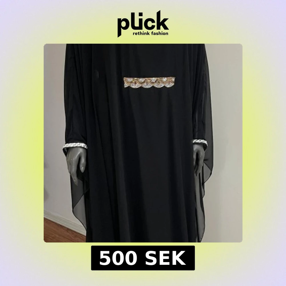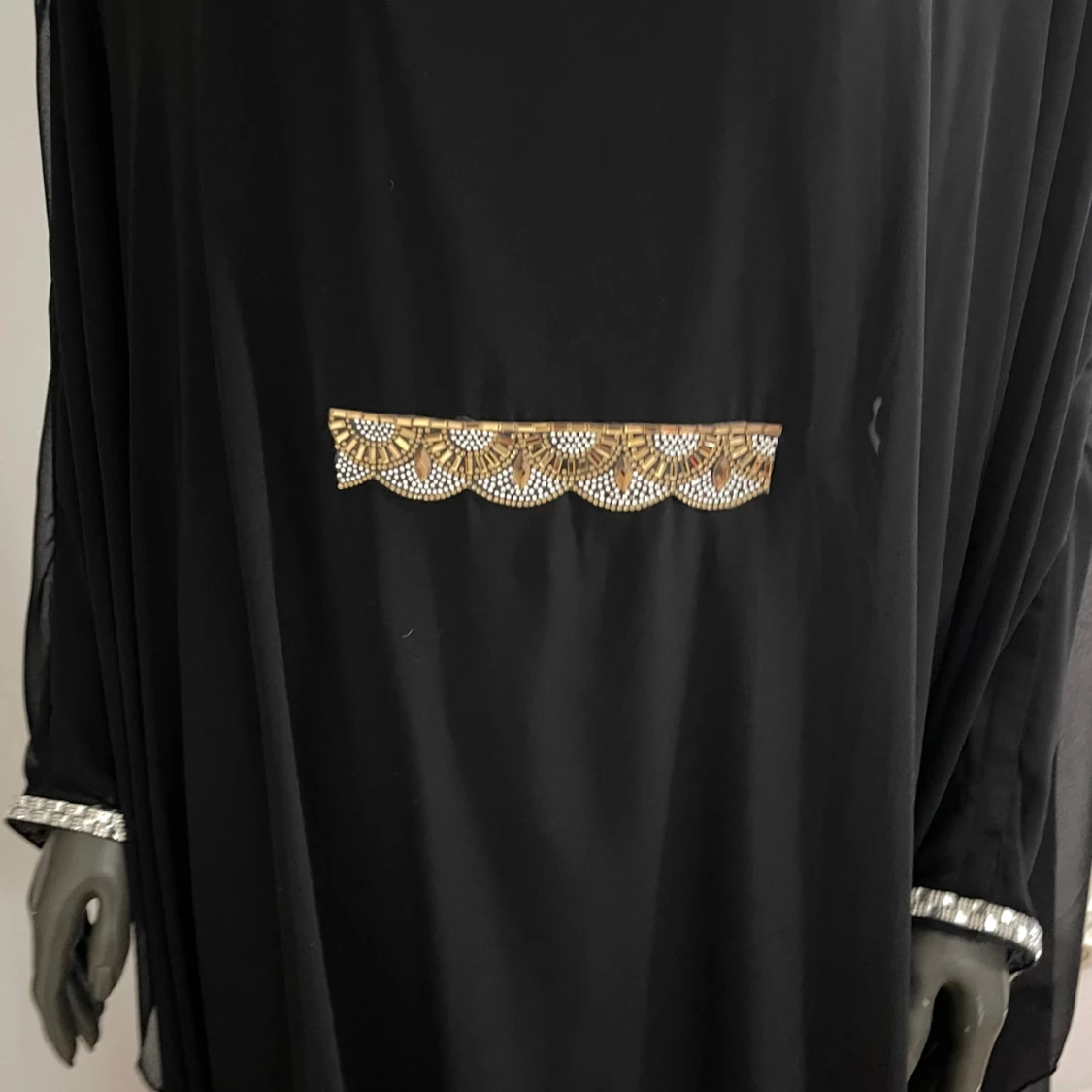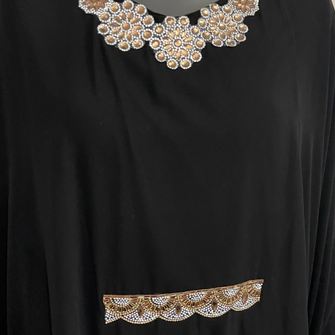 Elegant svart långklänning med löst fall och vackra guldfärgade broderier vid halsringningen och på bröstet. Ärmarna är vida och dekorerade med glittriga detaljer vid mudden. Klänningen har en flowy siluett och känns riktigt lyxig.
