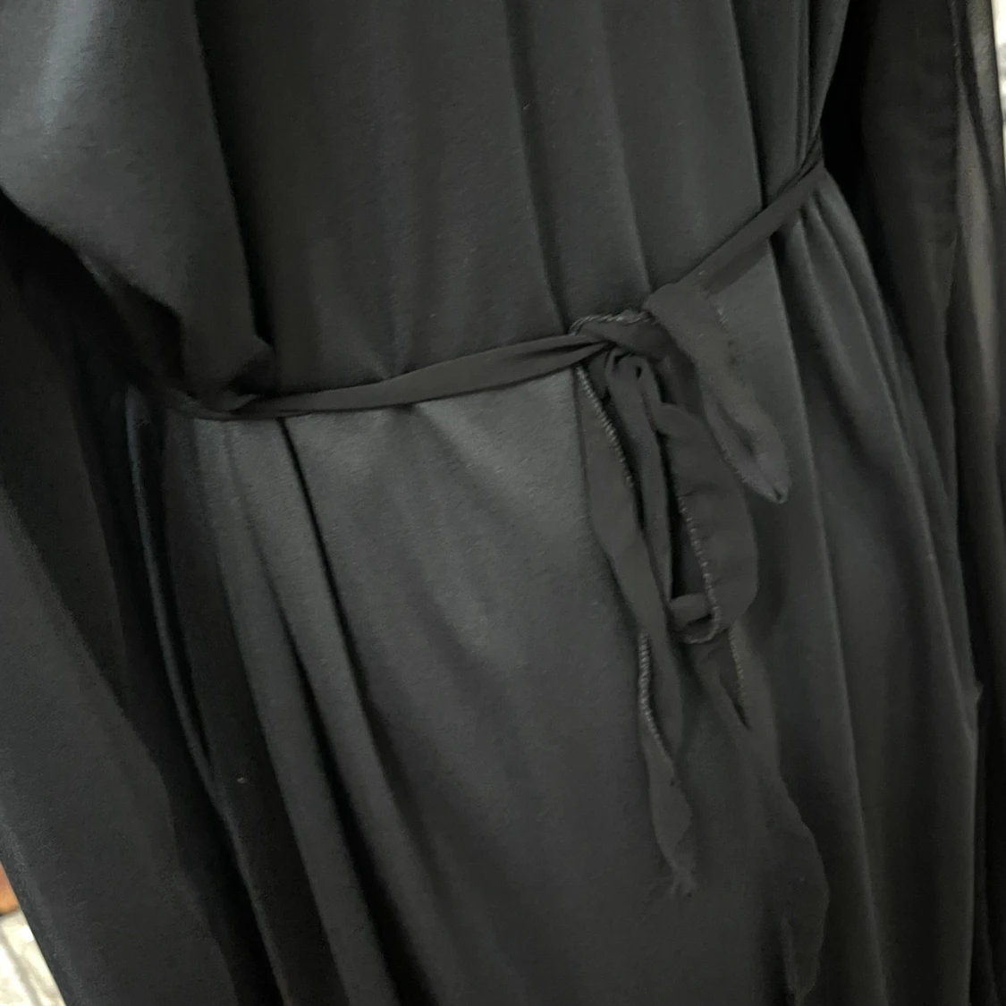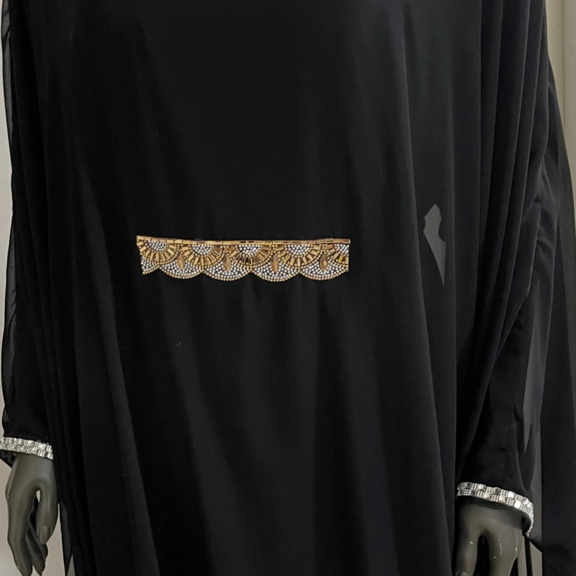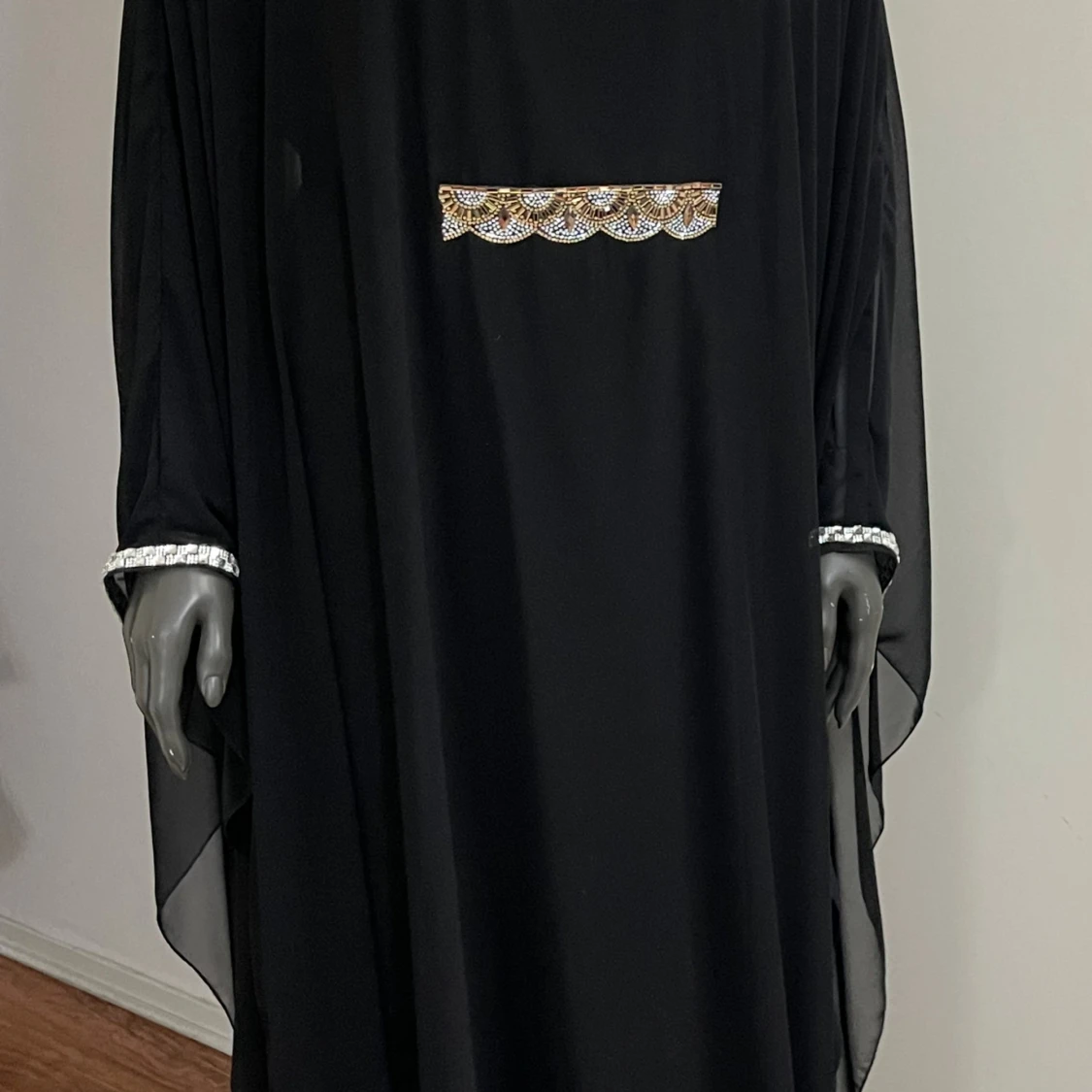Elegant svart långklänning med löst fall och vackra guldfärgade broderier vid halsringningen och på bröstet. Ärmarna är vida och dekorerade med glittriga detaljer vid mudden. Klänningen har en flowy siluett och känns riktigt lyxig.