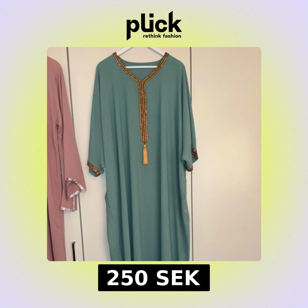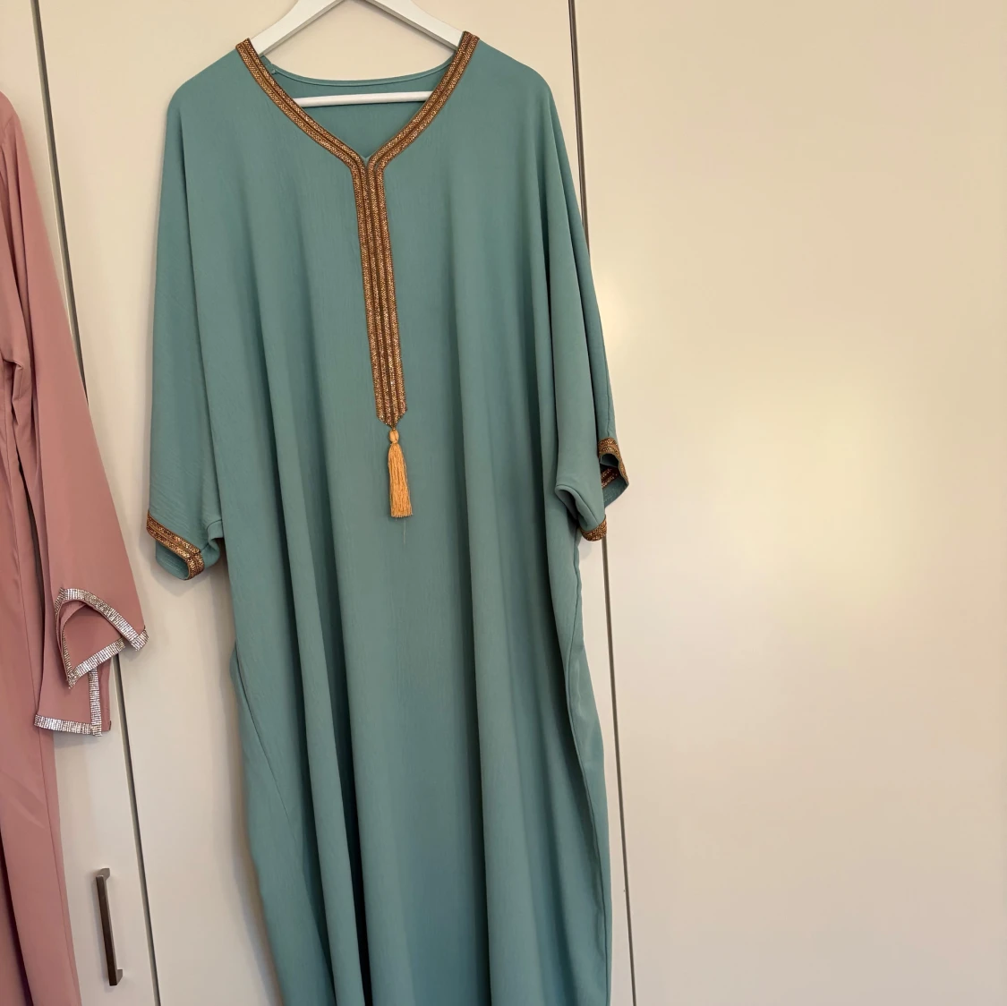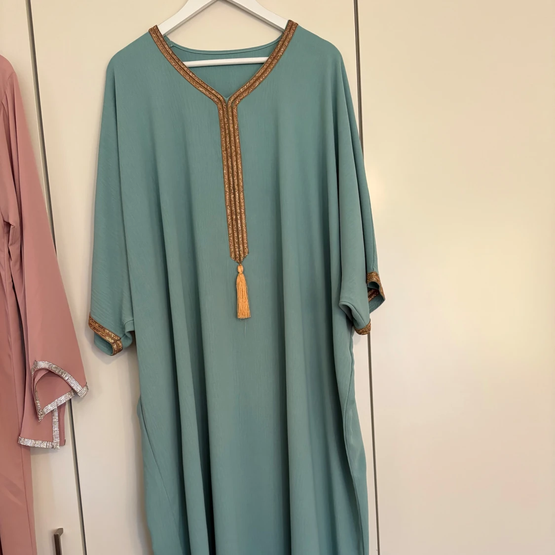 Säljer en ljusgrön lång kaftanklänning med vackra guldiga broderier längs halsringningen och ärmsluten. Klänningen har en lös passform och dekorativ tofs framtill. Perfekt för dig som gillar en elegant och bekväm stil. (Marockansk klänning)