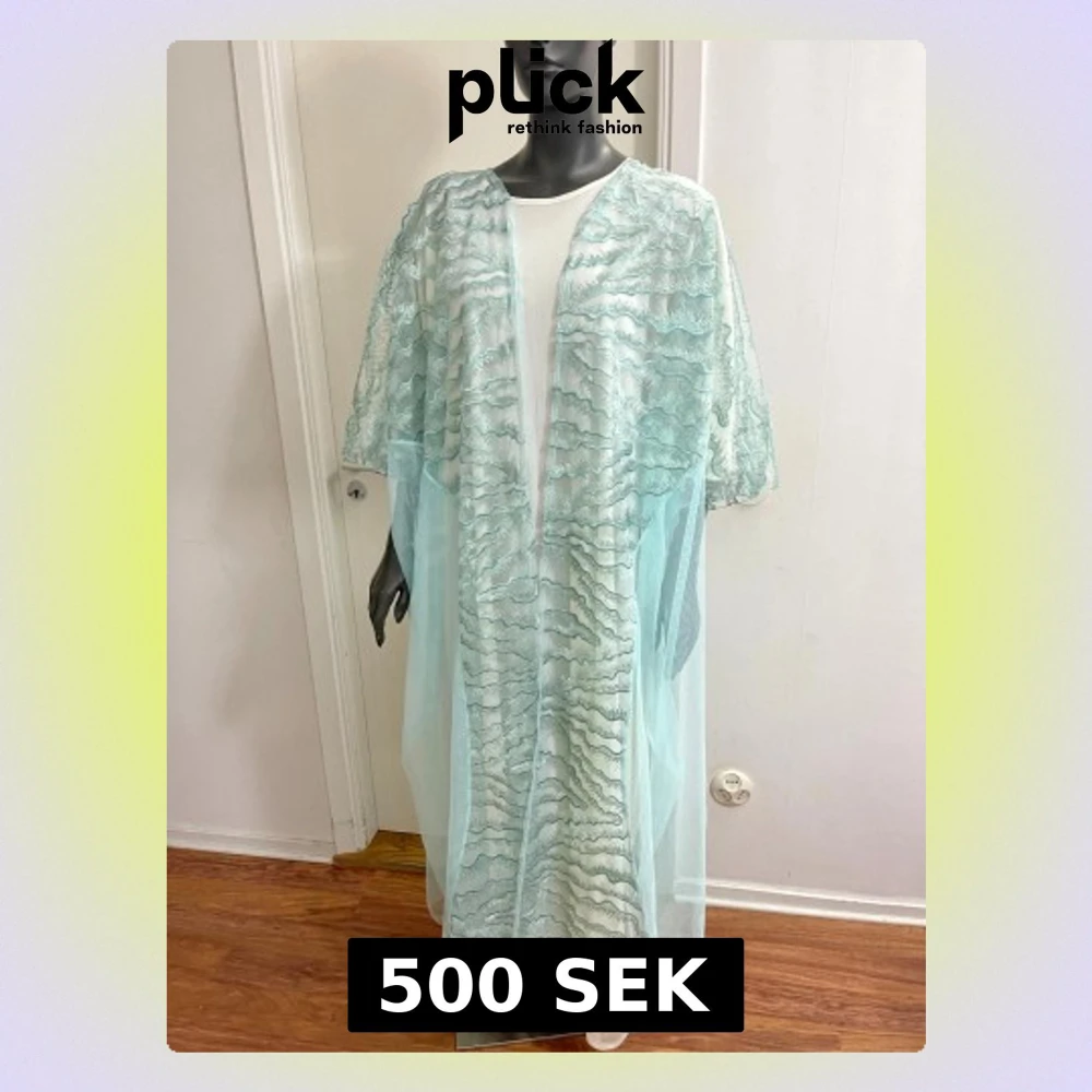 Superfin långklänning i ljusblå mesh med vågiga broderade detaljer. Klänningen är transparent och har lös passform med korta ärmar. Perfekt för dig som vill sticka ut med en unik och luftig look.