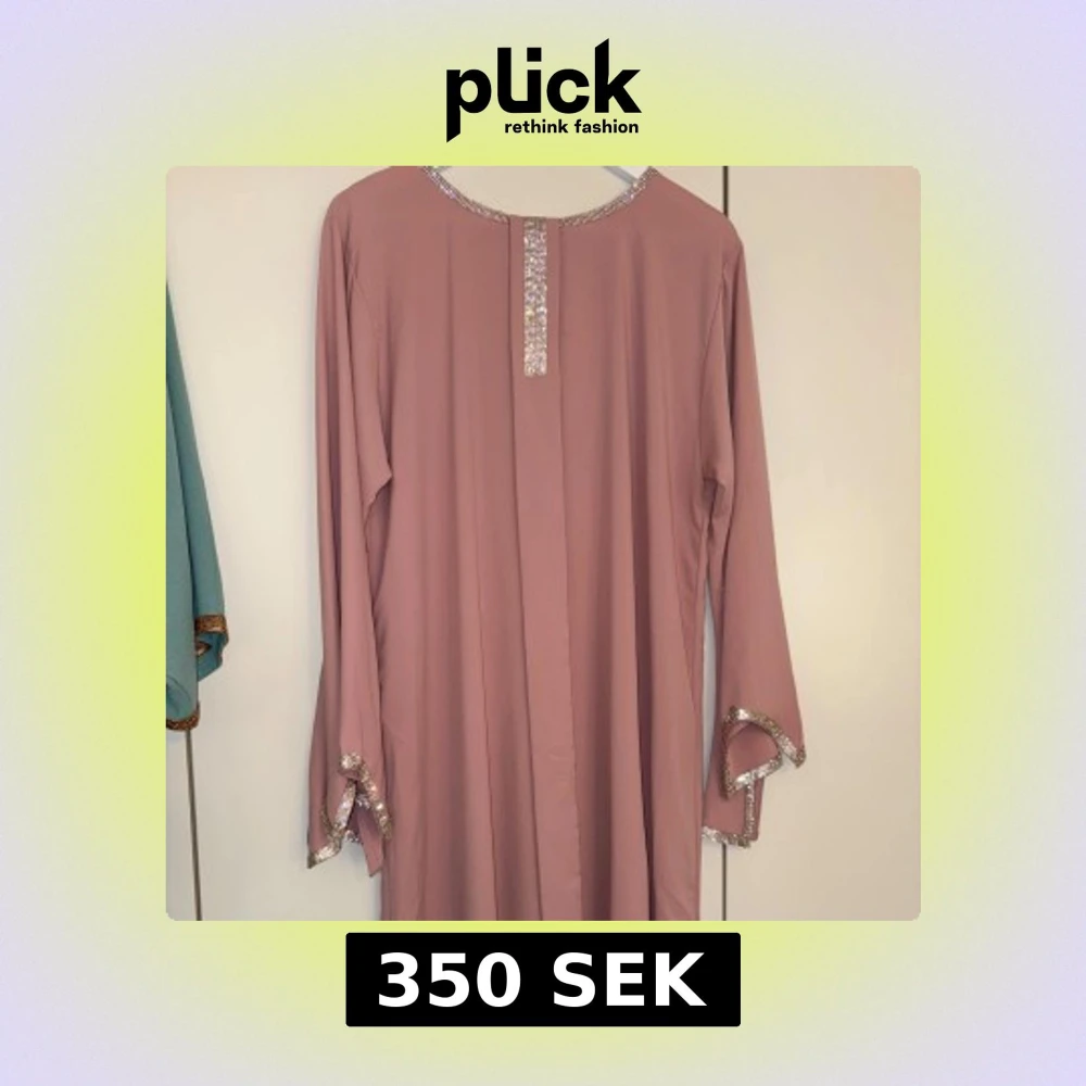 Säljer en lång, ljusrosa klänning med raka långa ärmar. Klänningen har dekorativa paljettdetaljer längs halsringningen, ärmsluten och framtill. Perfekt för dig som gillar enkel men glittrig stil. (Marockans Klänning) Köpt i Dubai.