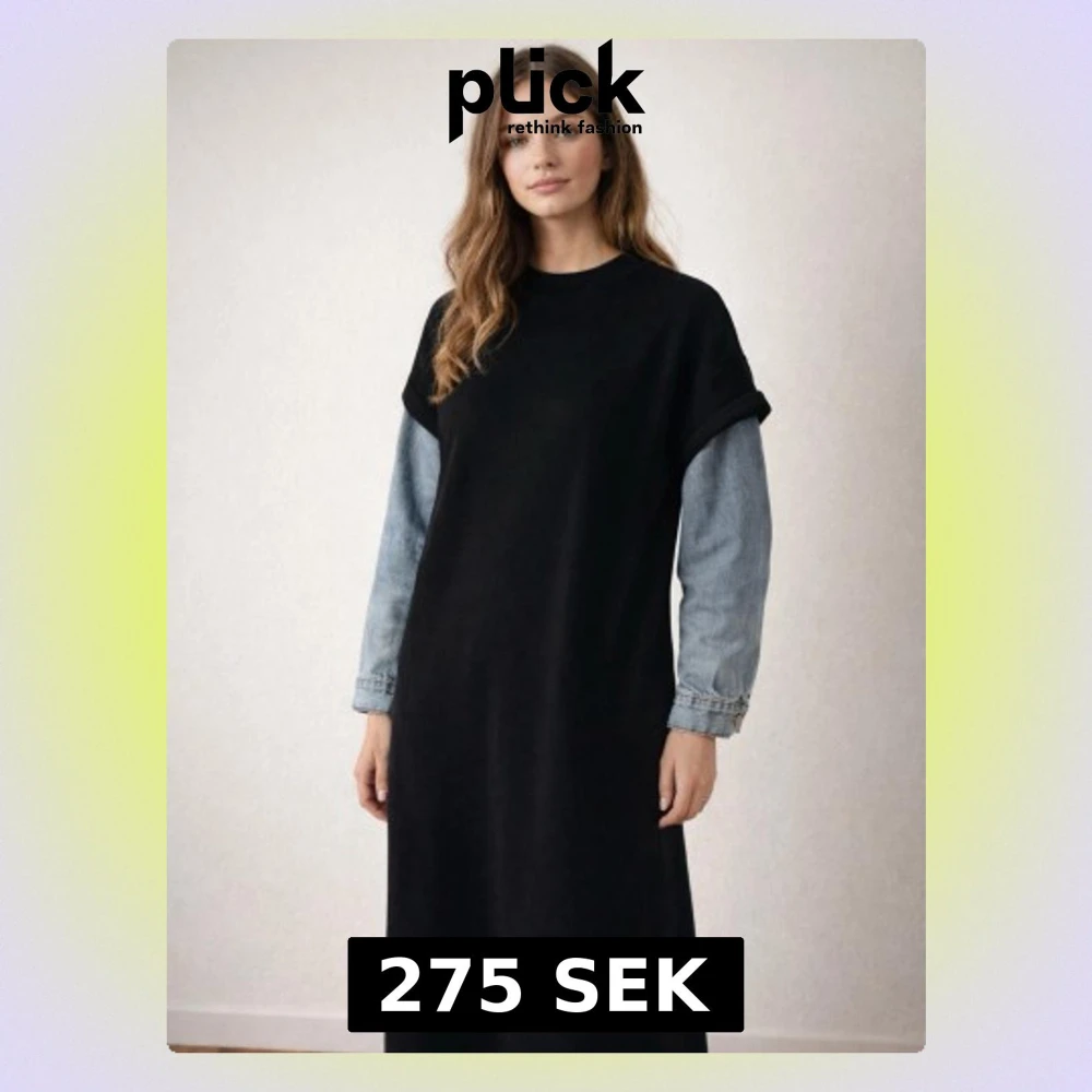 Cool svart långklänning med kontrasterande ljusblå jeansärmar. Klänningen har en rak passform och rund halsringning. Perfekt för dig som vill sticka ut med en unik och trendig look. Onesize passar S/L
