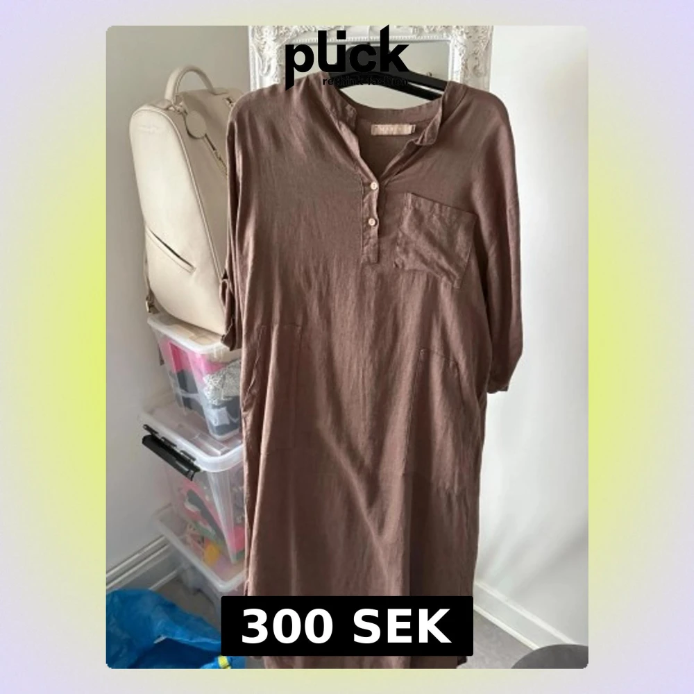 Säljer en brun långklänning från Marta i mjukt linne. Klänningen har trekvartsärm, knappar framtill, en bröstficka och två sidofickor. Enkel och chill design med liten krage och slits nedtill. Perfekt för dig som gillar avslappnad stil.