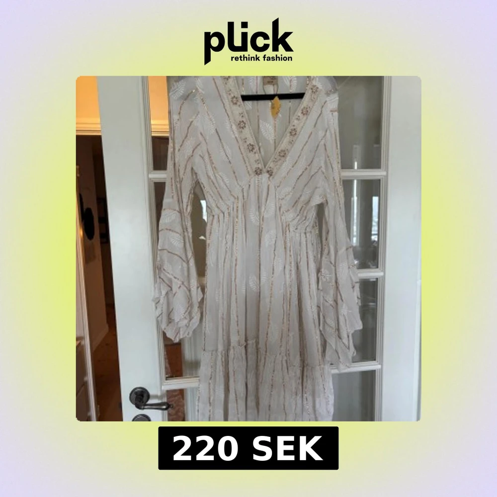 Superfin vit kortklänning i boho-stil med guldiga ränder och broderade blad. Klänningen har v-ringning med spetsdetaljer och vida, volangiga långärmar. Köpt i Grekland, aldrig använd! Prislapp kvar. Storlek One Size men passar mig som har xs/s