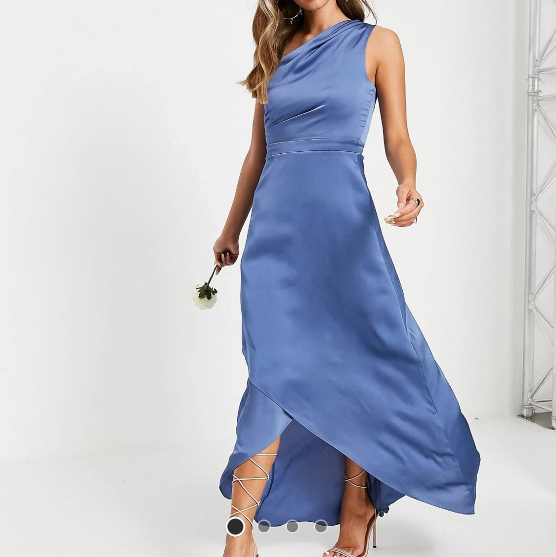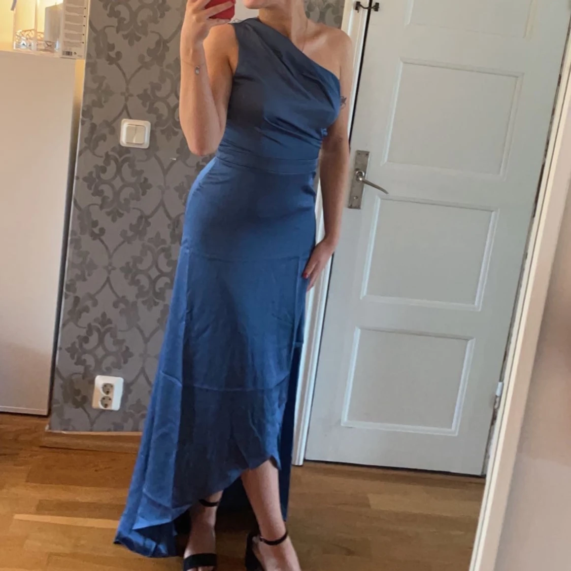 En långklänning med oneshoulder, blå. Använd en gång på ett bröllop, som ny. 600kr ny