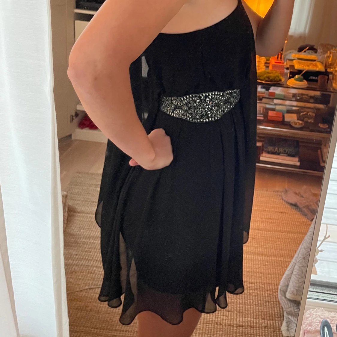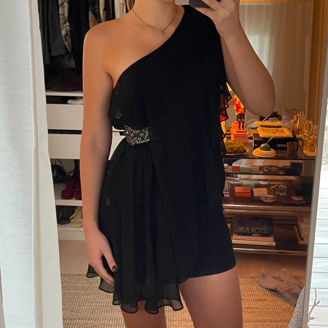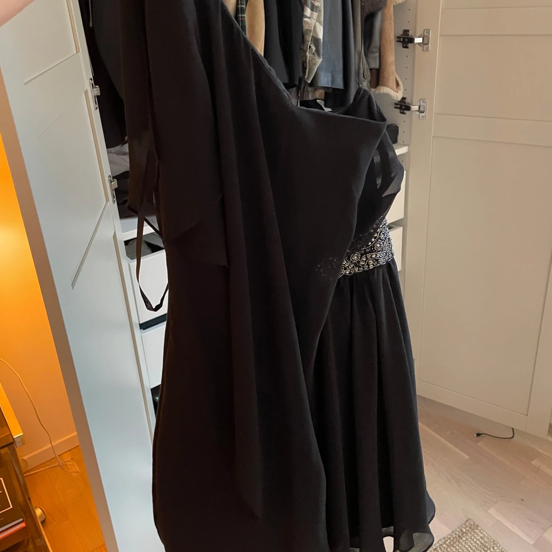 Elegant svart oneshoulder klänning med ett glittrande paljettbälte i midjan, perfekt för nyår!