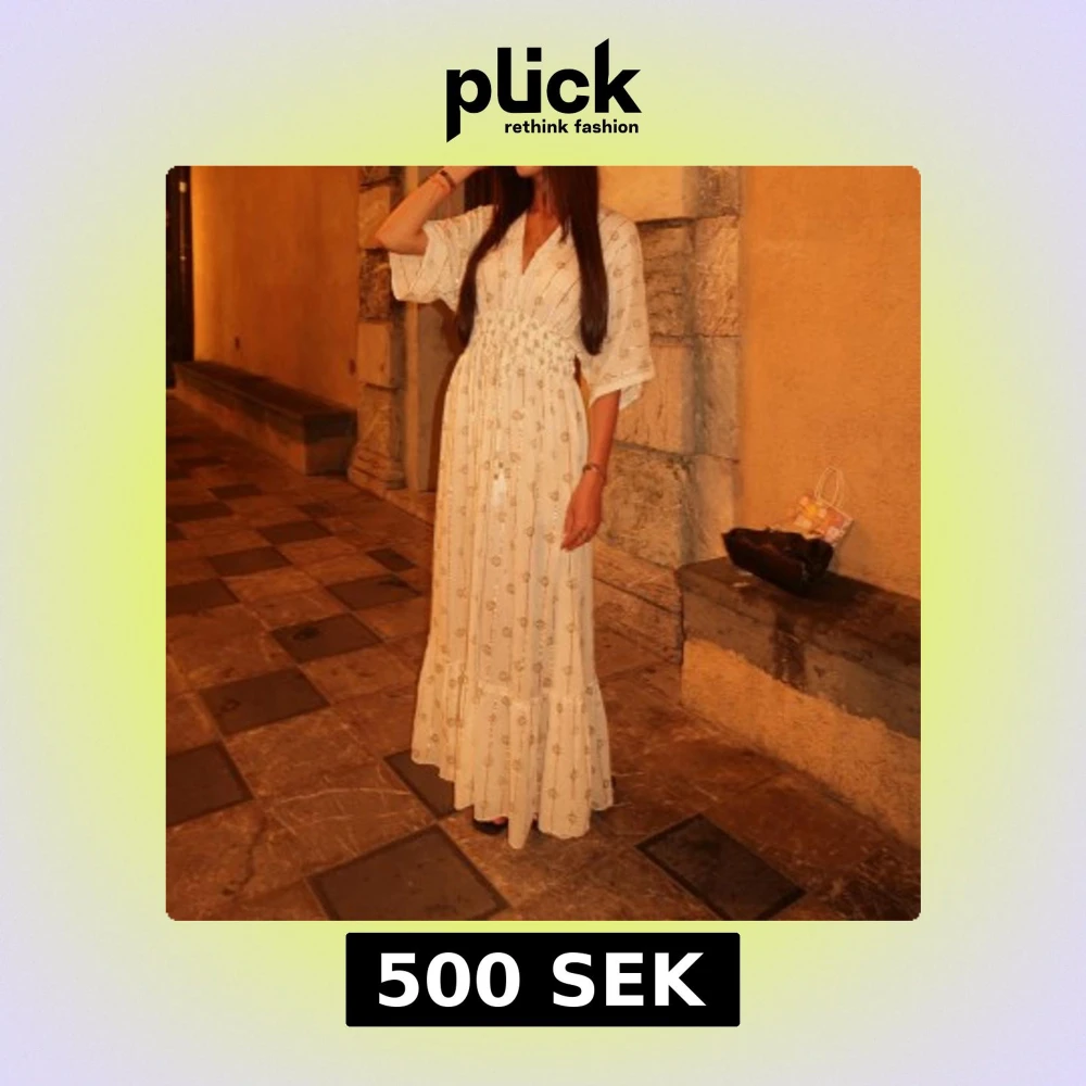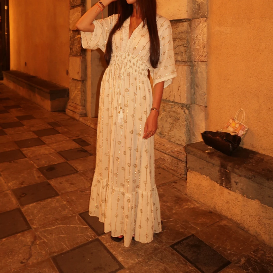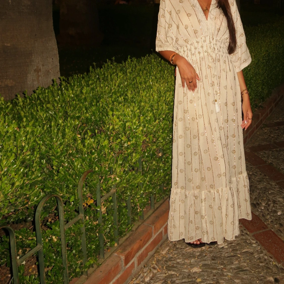 Superfin ljus långklänning i bohemisk stil med guldiga detaljer och diskret mönster. Klänningen har v-ringning, vida trekvartsärmar och markerad midja med smock. Perfekt för sommarkvällar och ger en romantisk vibe.