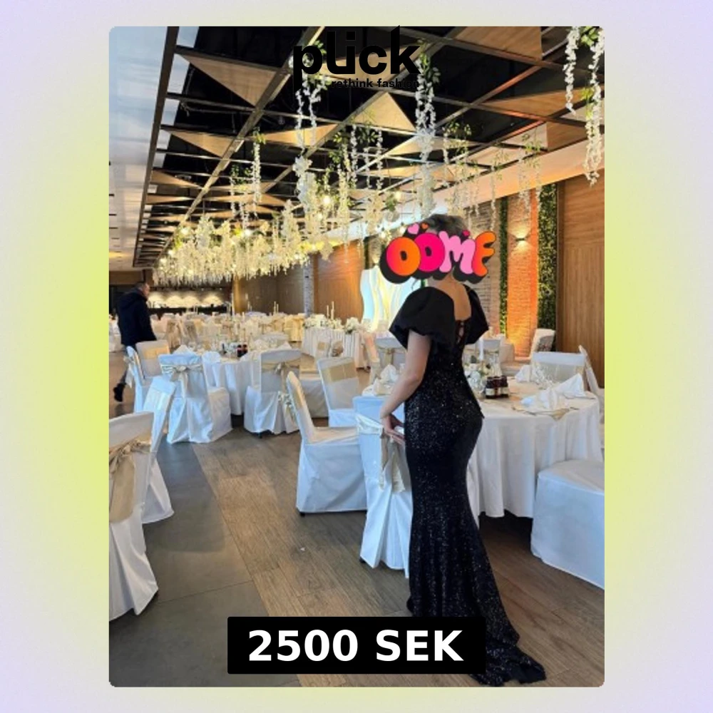 Säljer en otroligt vacker och elegant aftonklänning som passar perfekt för bröllop, bal, fest eller andra speciella tillfällen. Klänningen är i klassisk svart färg med diskreta glittriga detaljer som ger en lyxig och sofistikerad look. Den har en figurnära modell som framhäver silhuetten och en elegant öppen rygg med justerbar snörning, vilket gör att du kan anpassa passformen precis som du vill. Tack vare detta passar den som en universell storlek.