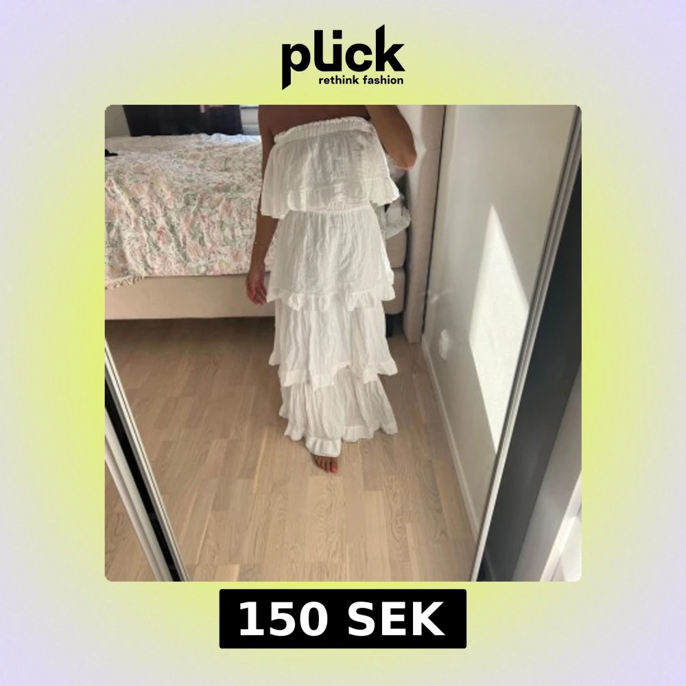 Superfin vit långklänning med flera lager volanger och elastisk midja. Klänningen kan bäras både offshoulder och med axelband, vilket ger en flexibel look.