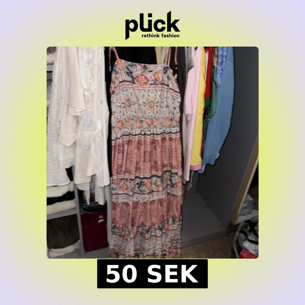 Bomullsklänning, kan användas utan snöre och med snörning/band i axlarna. Har resor i midjan och volanger nertill