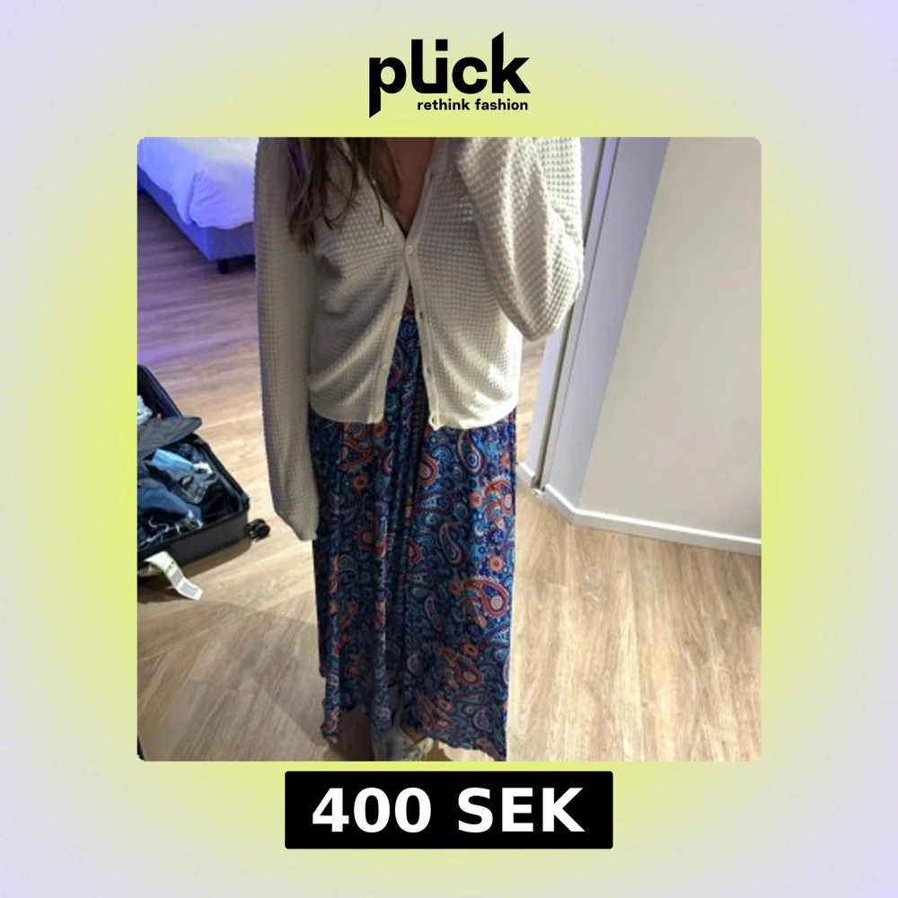Säljer en färgstark långklänning med paisleymönster i blått, rött och vitt. Klänningen har v-ringning, smala axelband och fin lång öppen rygg. Materialet känns lätt och luftigt. Köpt i Grekland! Kan gå ner i pris vid snabb affär!