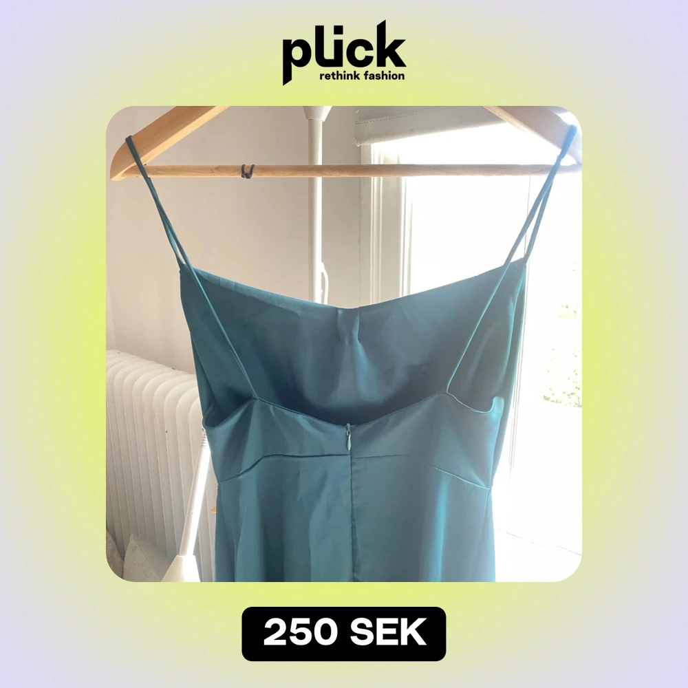 Säljer en elegant turkos långklänning med smala axelband. Perfekt för sommarens fester eller en fin middag. Klänningen har en enkel och stilren design med en lätt glansig yta.