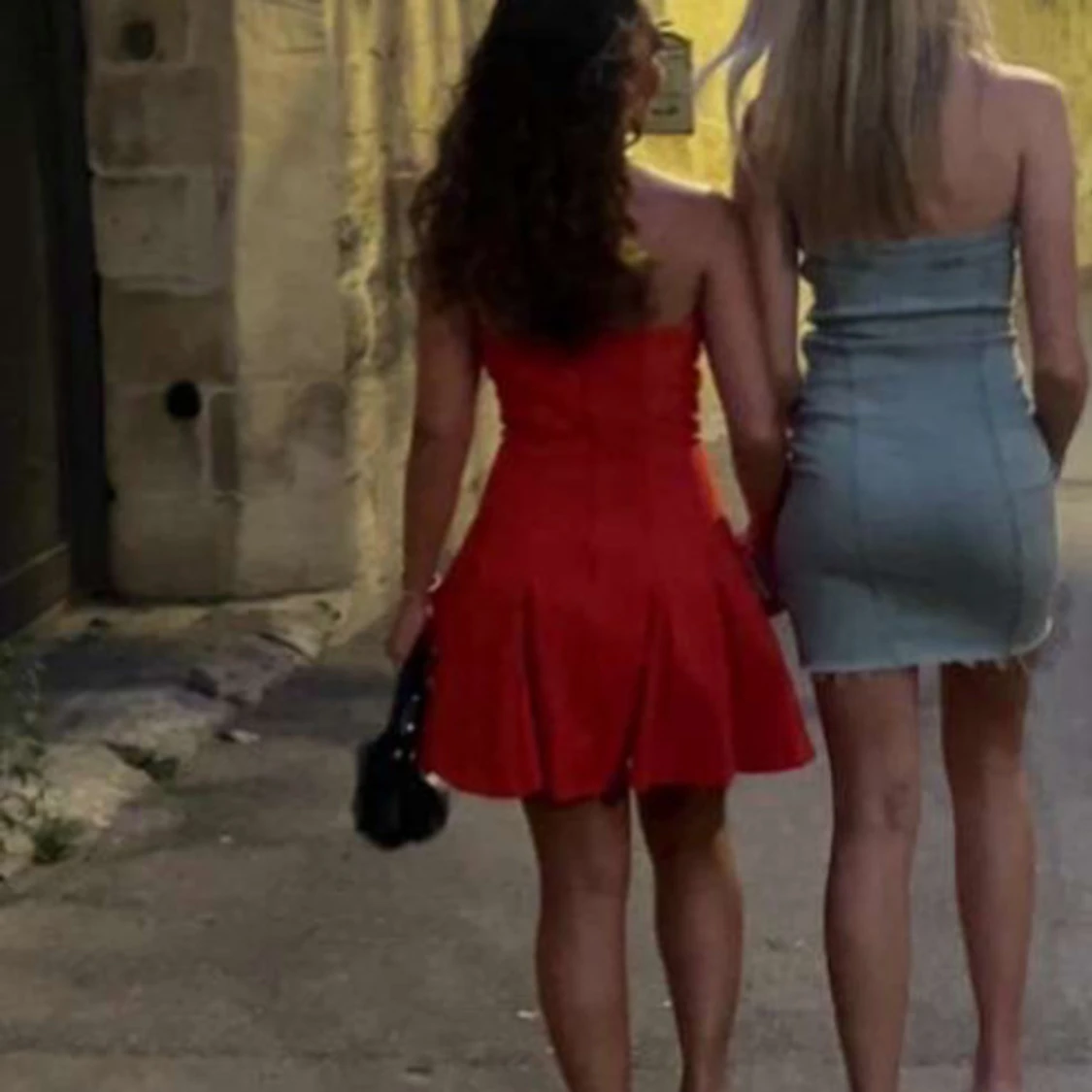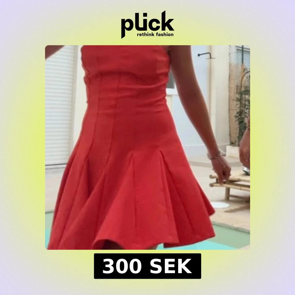 Säljer en röd axelbandslös klänning med utsvängd kjol och markerad midja. Klänningen har en figurnära överdel och flera sömmar som ger en snygg passform. Perfekt för dig som vill sticka ut med en färgstark look.
