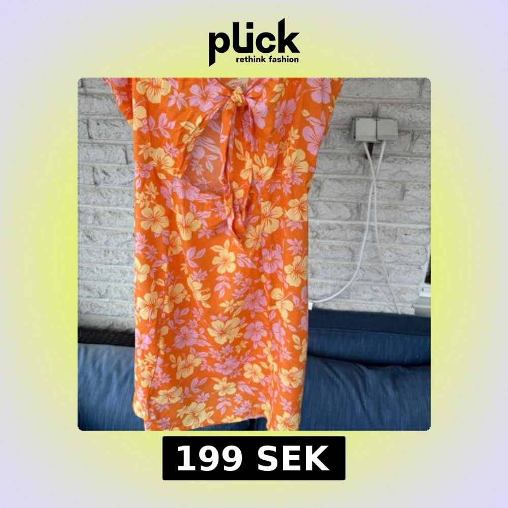 Säljer en färgglad orange klänning från H&M med blommigt mönster i gult och lila. Klänningen har smala axelband och en knytning framtill som ger en söt detalj. Perfekt för sommarens varma dagar!🌸💕🌸