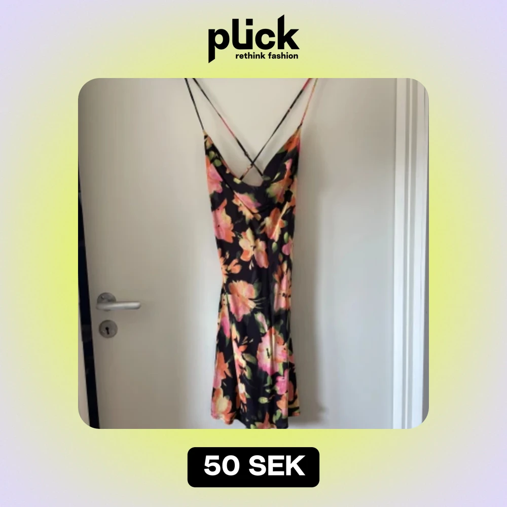 Säljer en superfin blommig klänning perfekt för sommaren! Den har en öppen rygg med tunna axelband och ett färgglatt blommönster i rosa, orange och grönt på en svart bakgrund. Klänningen är i ett lätt och luftigt material, perfekt för varma dagar.