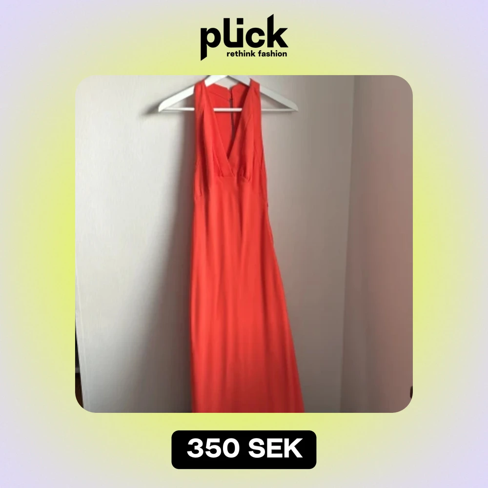 Orange långklänning från MNG (artnr 67009238) med djup v-ringning och ärmlös. Perfekt för sommarens fester. Klänningen har en dragkedja i sidan för enkel påklädning. Materialet känns lätt och luftigt. Använd 1 gång på bröllop. 💒