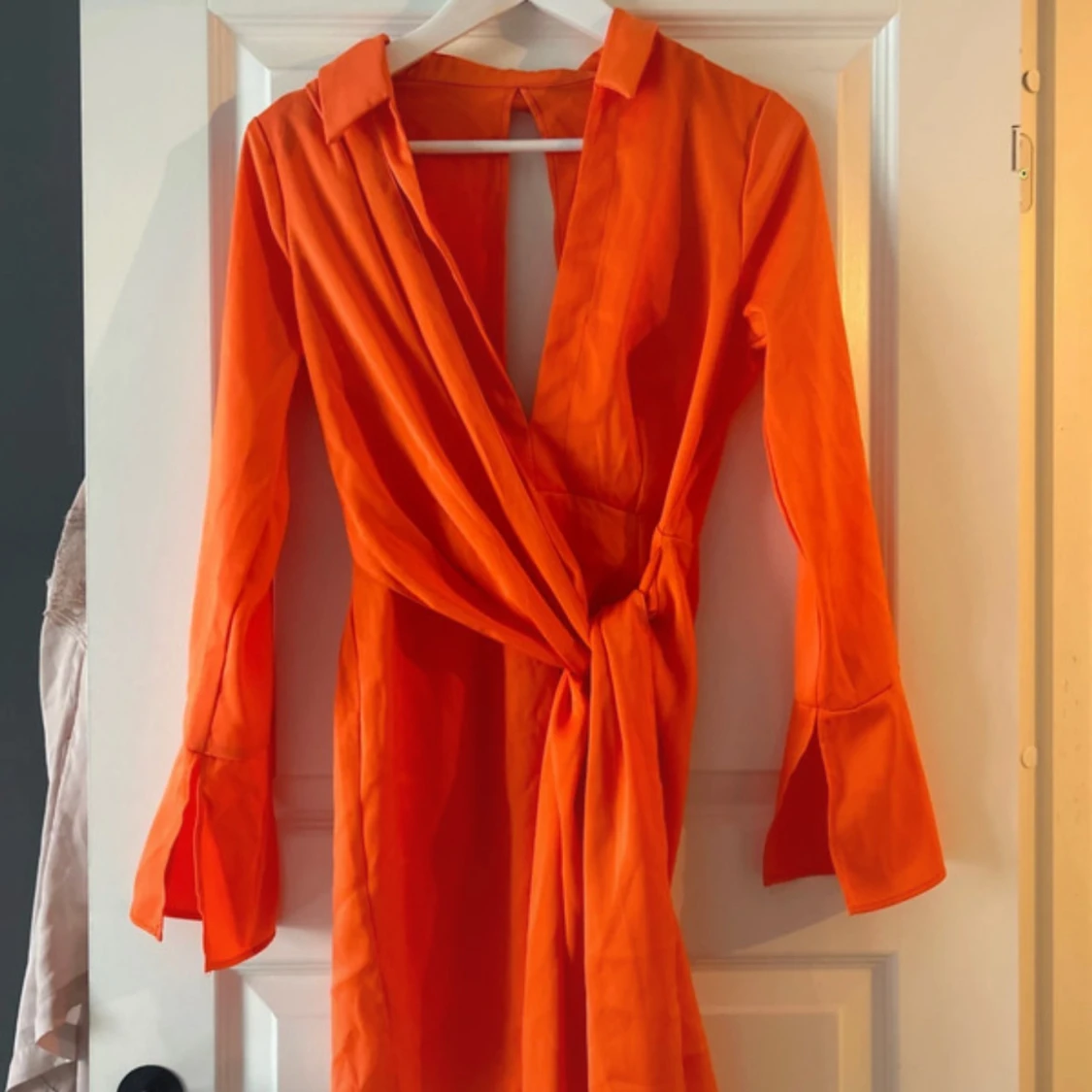 Snygg orange omlottklänning med långa ärmar och knytning i midjan. Perfekt för en färgstark look.