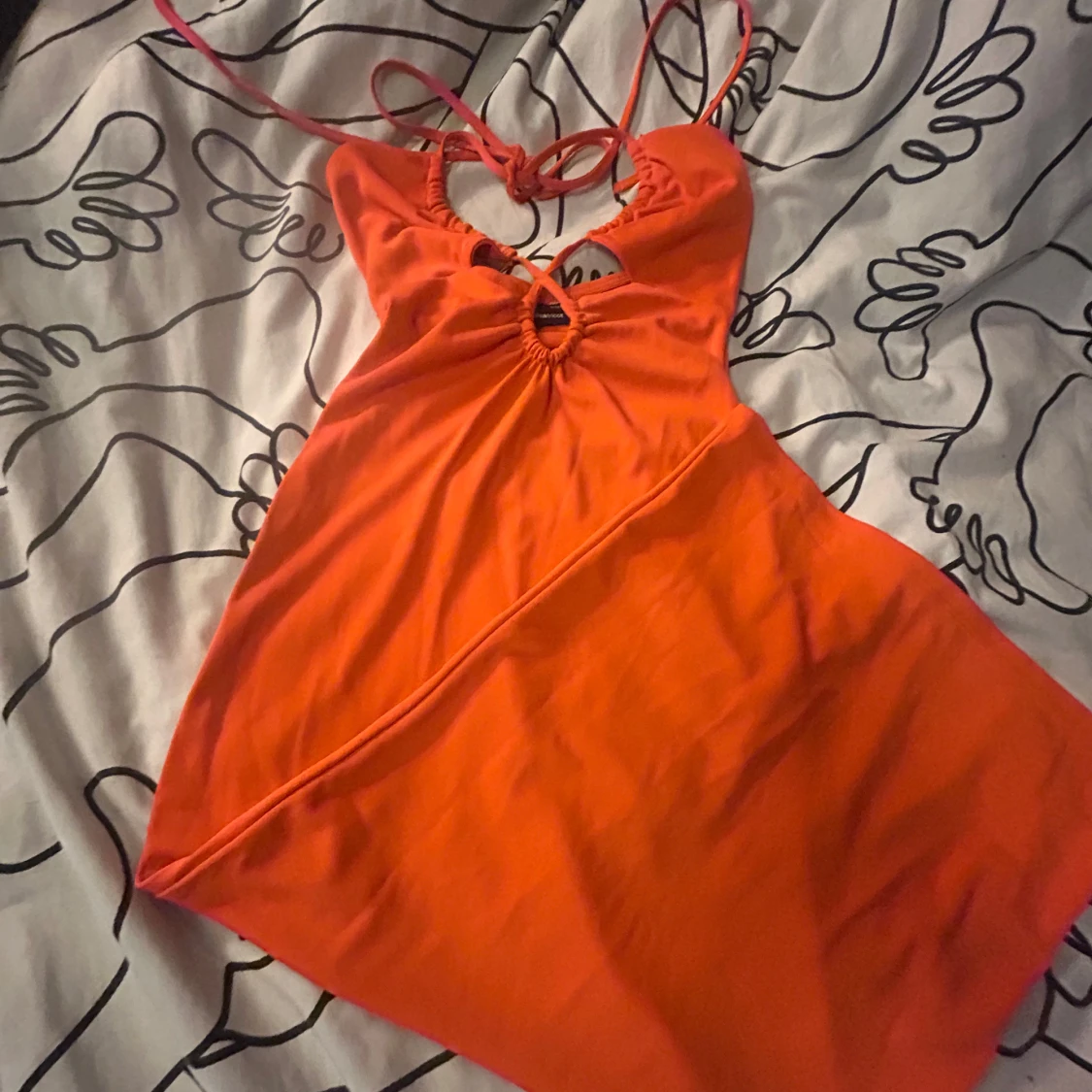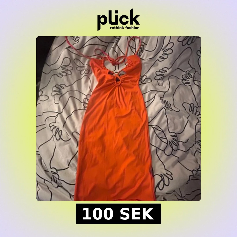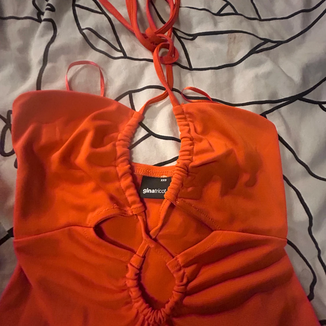 Snygg orange klänning från Gina Tricot i storlek XXS. Modellen är kort med omlottdetaljer och snörning framtill, samt tunna axelband som knyts i nacken. Materialet är mjukt och stretchigt, perfekt för dig som gillar färgstarka och trendiga plagg.