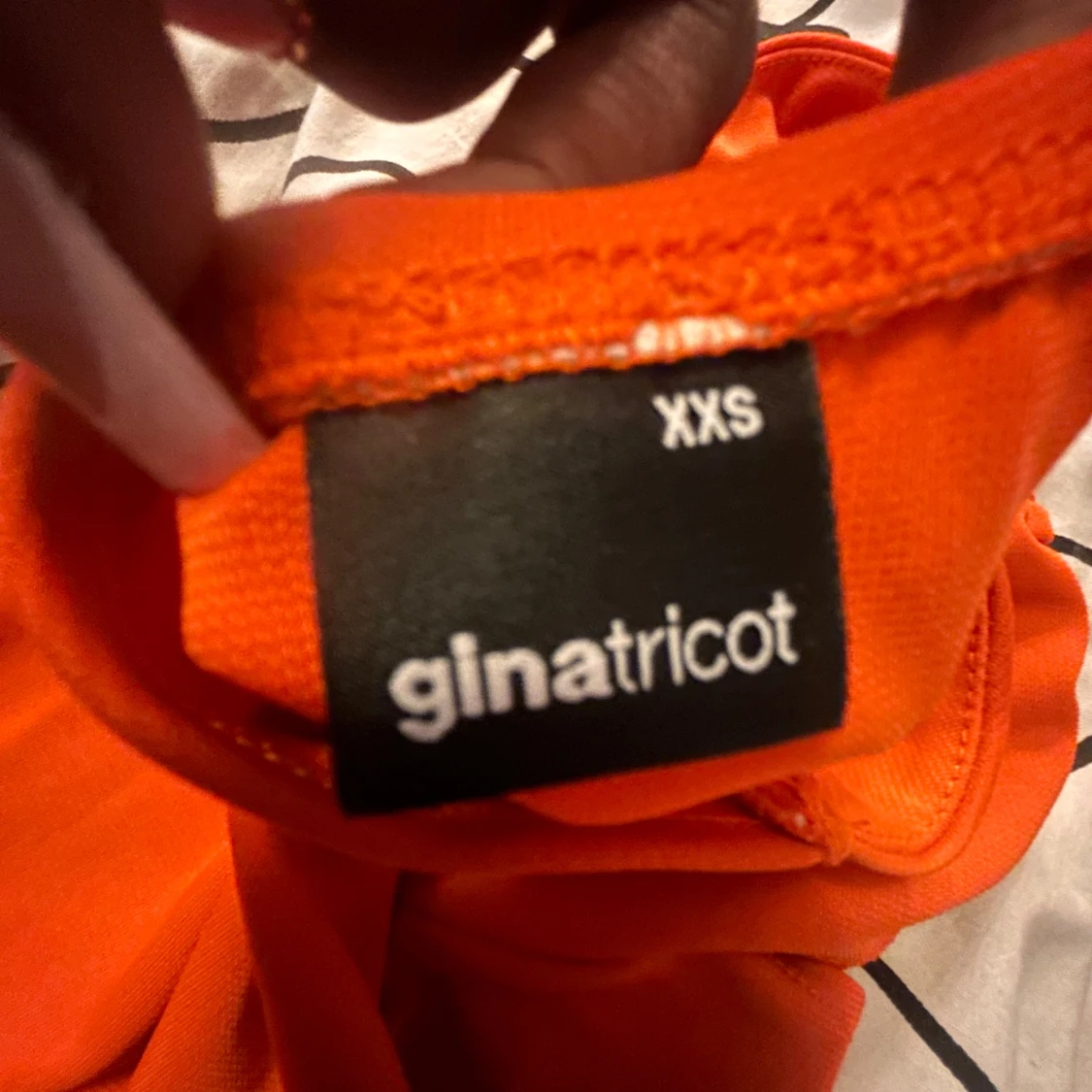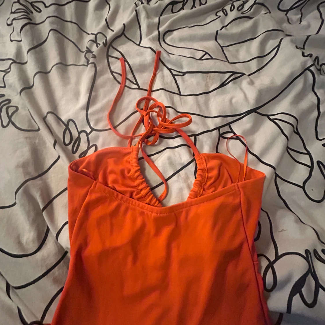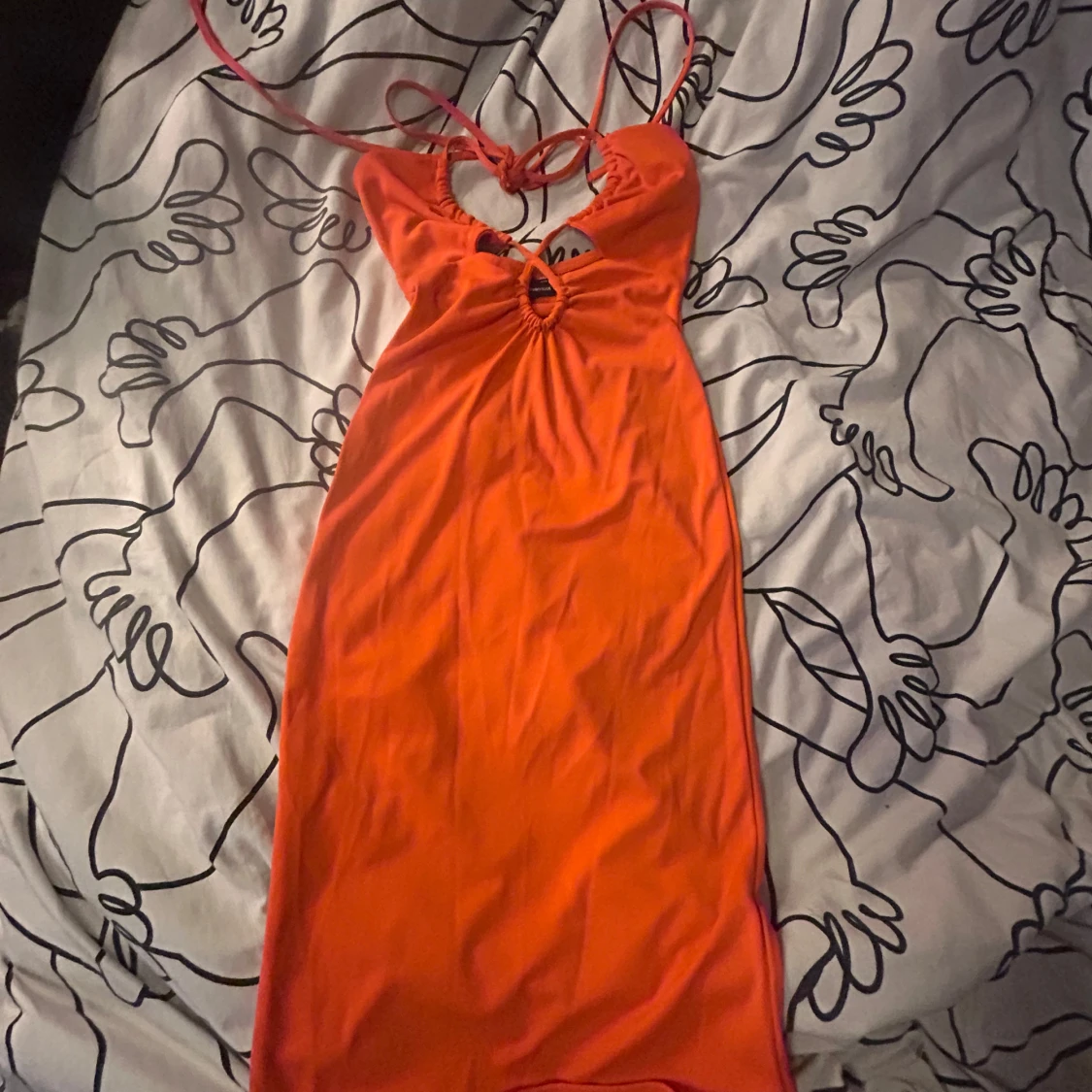 Snygg orange klänning från Gina Tricot i storlek XXS. Modellen är kort med omlottdetaljer och snörning framtill, samt tunna axelband som knyts i nacken. Materialet är mjukt och stretchigt, perfekt för dig som gillar färgstarka och trendiga plagg.
