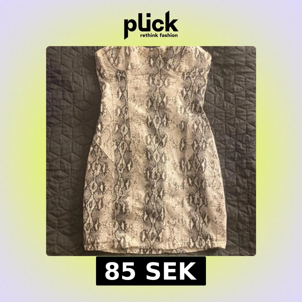 Trendig axelbandslös klänning med ormmönster i svart och beige. Klänningen har en dragkedja bak och en figurnära passform som framhäver silhuetten. Perfekt för en utekväll eller speciella tillfällen. Vadderad typ vid bysten så man inte behöver ha bh!