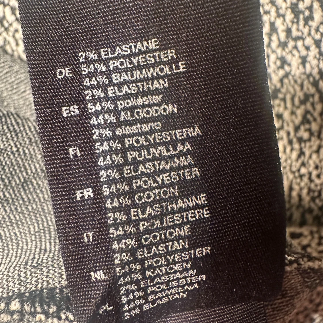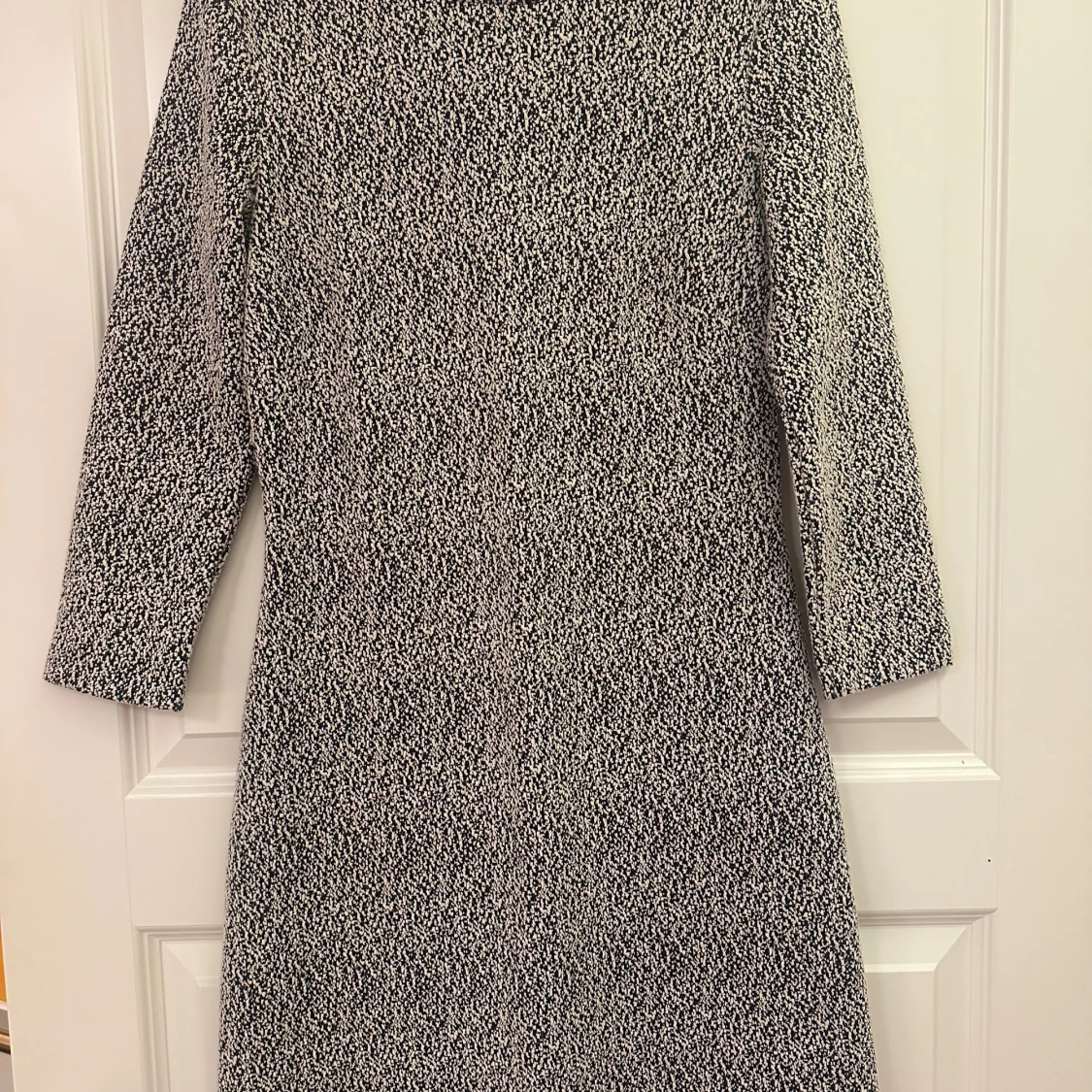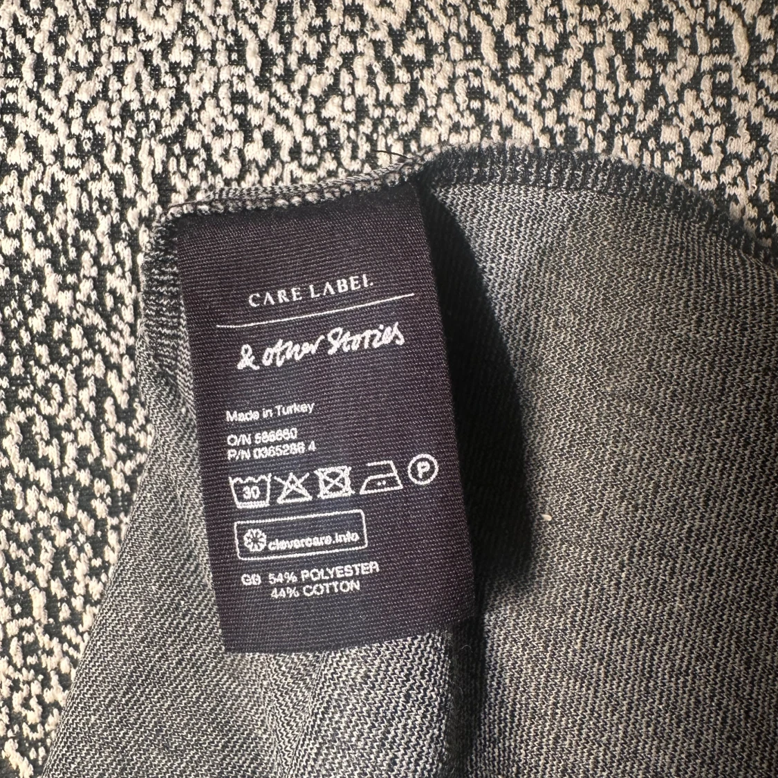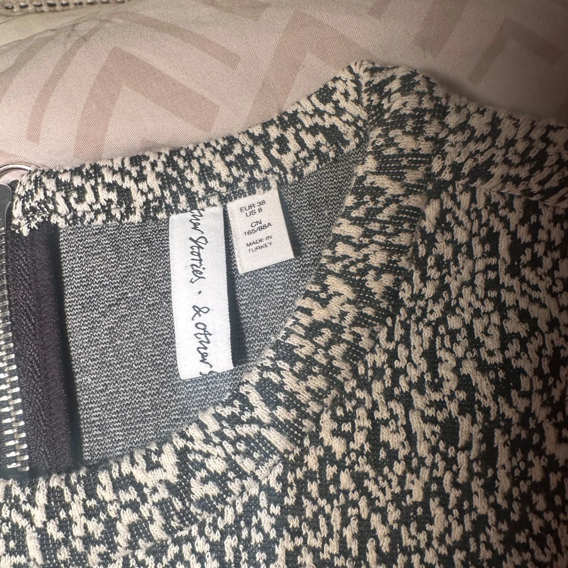 Snygg svartvit mönstrad klänning från & Other Stories med trekvartsärm och rund hals. Materialet är en mix av bomull, polyester och elastan som ger en skön stretch. Klänningen har en rak passform och dragkedja i sidan för enkel påklädning.