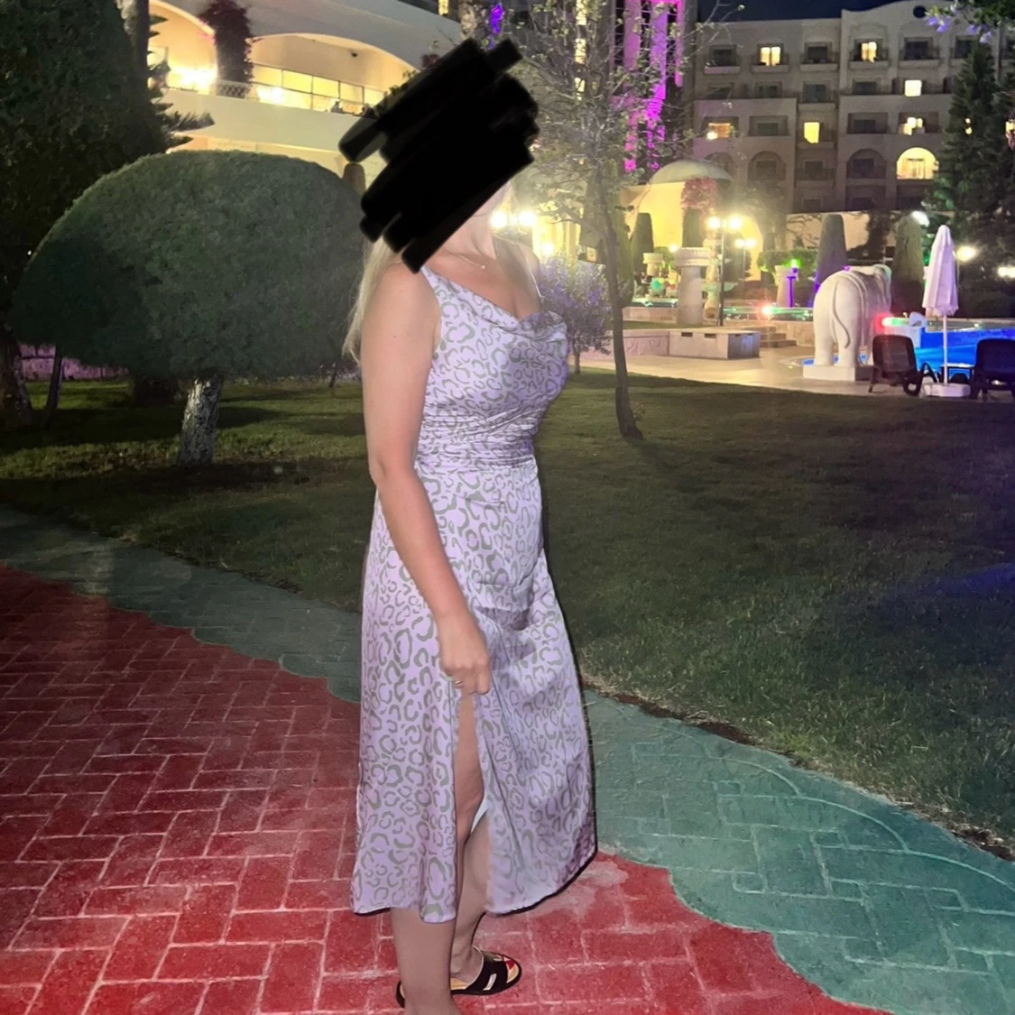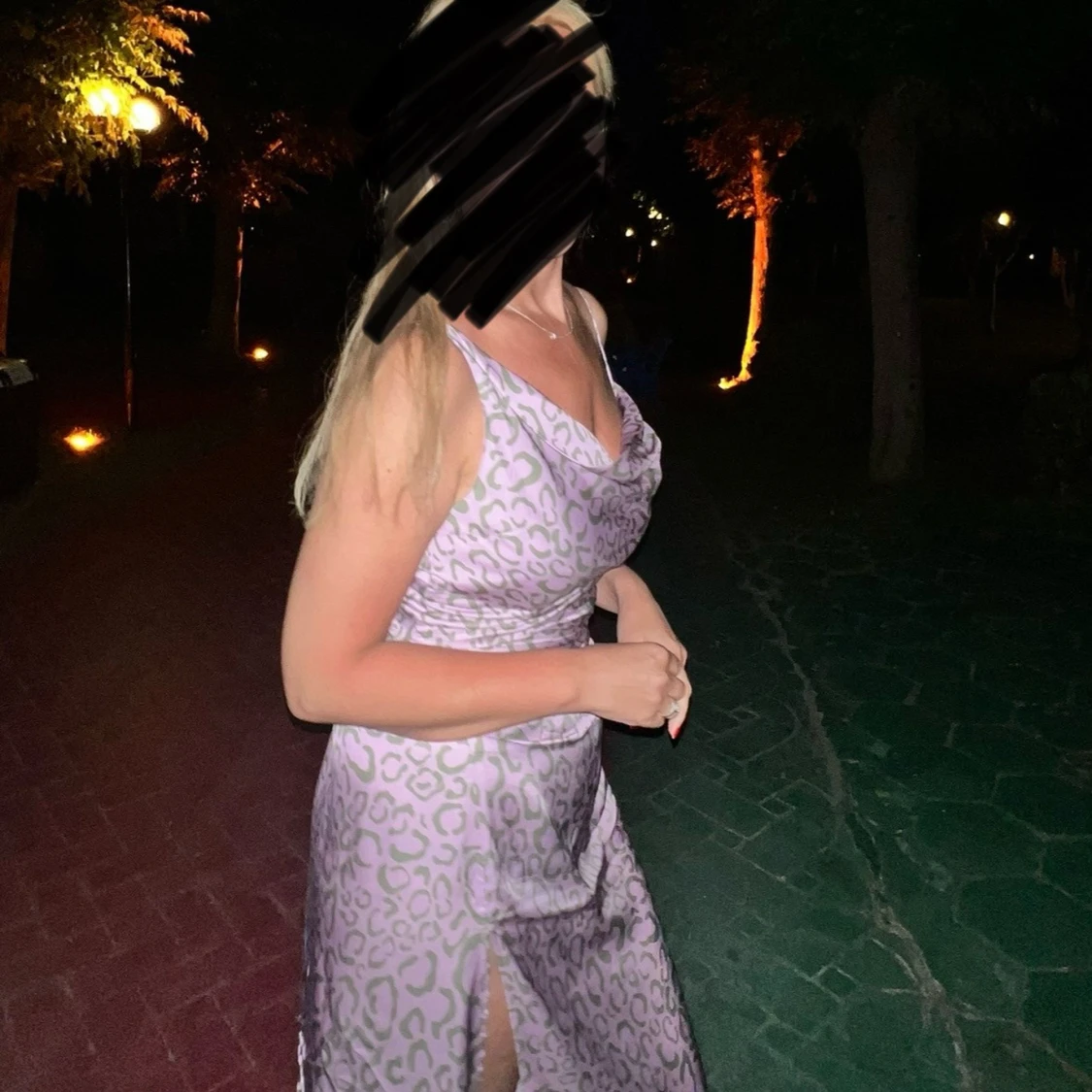 Lila satin klänning med leopard print, storlek S-M, banden gör att man kan anpassa storleken