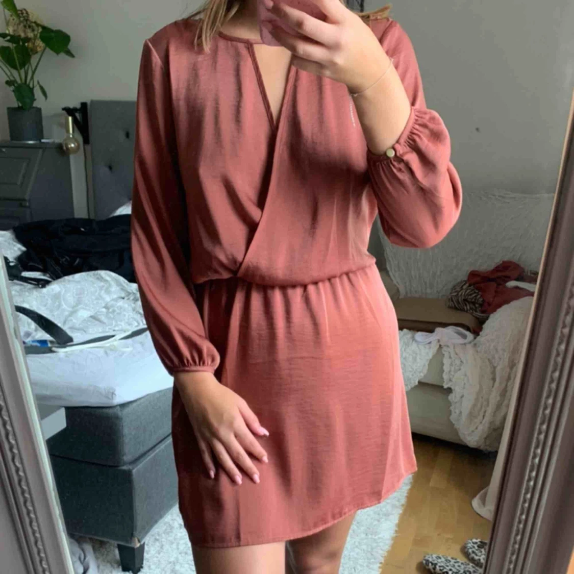 Så fin klänning med djup ringning i rygg! Är tyvärr för liten för mig! Använd en gång så i fint skick. Frakt ingår i priset